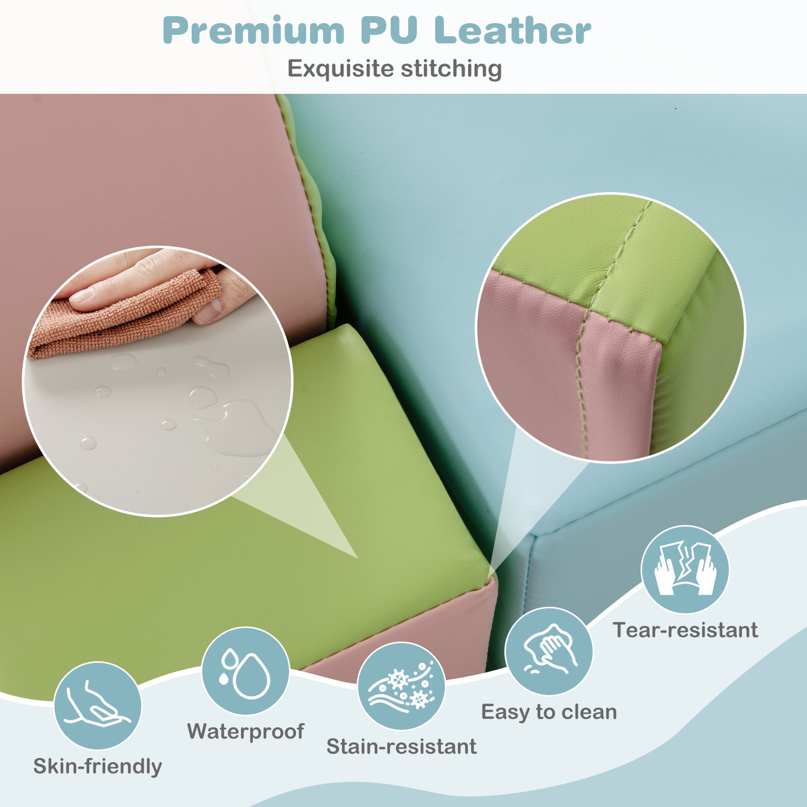 - Premium PU Leather: The building blocks are covered in skin-friendly PU leather with exquisite stitching, which is reliable and tear-resistant, ensuring long-term use. The smooth surfaces are also waterproof and stain-resistant, making cleaning a breeze.