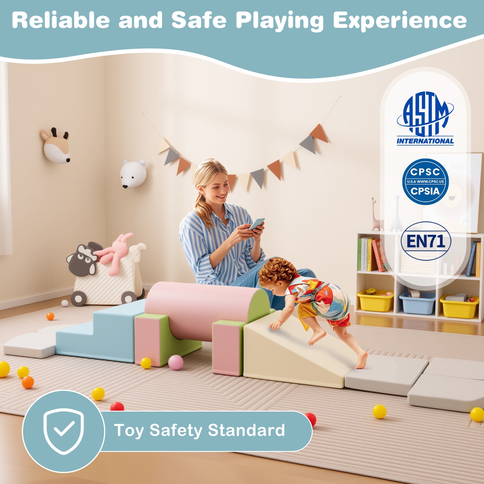 - Educational and Developmental Benefits: Encourage learning through play as children stack, build, and manipulate the blocks to understand shapes, sizes, and spatial relationships. This crawling climbing sliding activity play set also helps in physical development, enhancing balance, strength, and hand-eye coordination.