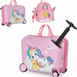 - 2-Piece Lovely Kids Luggage Set: You will get a 18″ ride-on suitcase and a 12″ travel backpack, both are decorated with vivid bee patterns, very attractive to kids. Besides, the backpack also contains an info card inside where kids can write down names to define the trolley case set as their own property. Without doubts, it will be the best partner for their adventures.