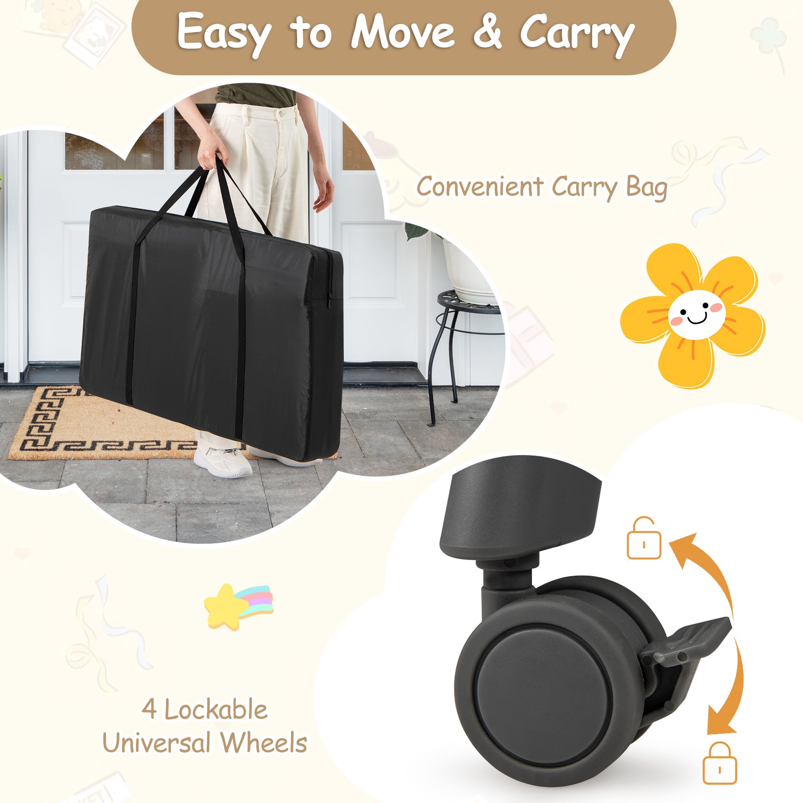 - Easy to Move & Carry: Equipped with 4 lockable universal wheels, this infant bedside crib can be moved from room to room effortlessly. It is easy to install and detach without tools. Moreover, a carrying bag is included for easy storage and transportation.