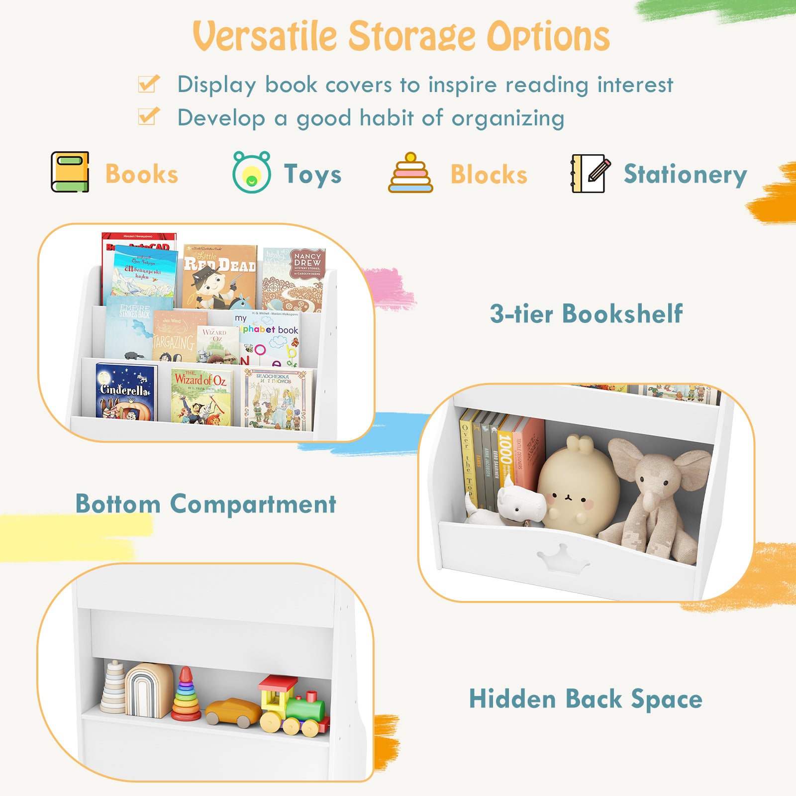- Classified Storage Space: Featuring 3-tier bookshelf and an open compartment, this storage organizer offers ample space to display books, toys, blocks and stationary. The hidden back space also provides a convenient place for less frequently used small items.Â