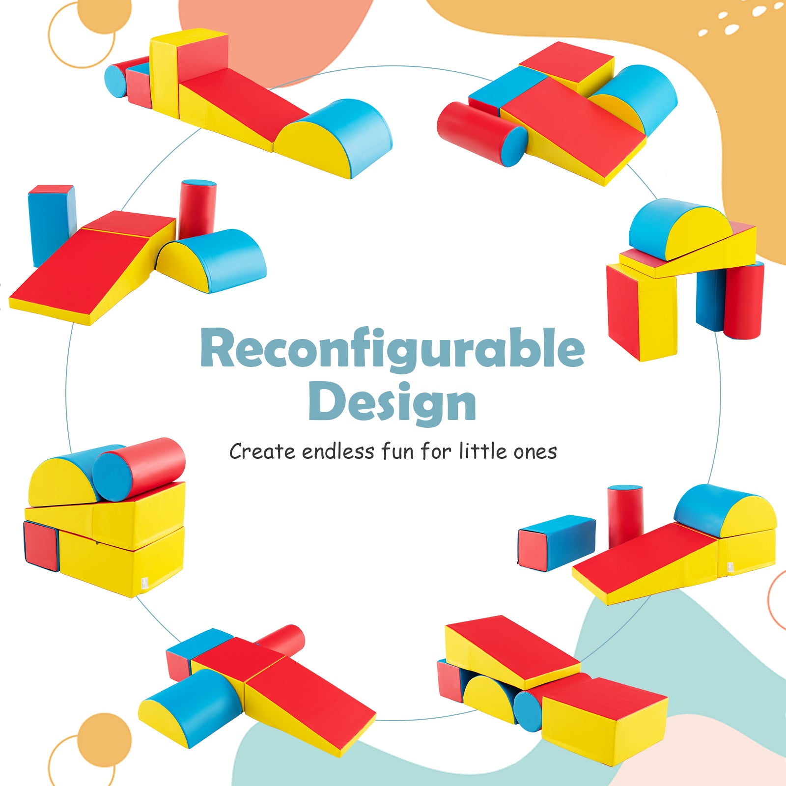 This 5-piece foam play set will bring hours of fun for your child! This foam play set includes 5 soft foam blocks in different shapes, which are small rectangles, large rectangles, triangles, cylinders, and half moons. The bright color stimulates kids to improve their motor skills, balance ability, body coordination, and more. The EPE foam filling effectively reduces impact, and the soft surface and corners also protect kids from injuries. The waterproof PU cover features a smooth zipper for quick detachment.
