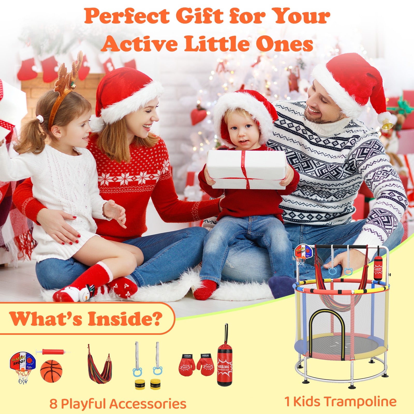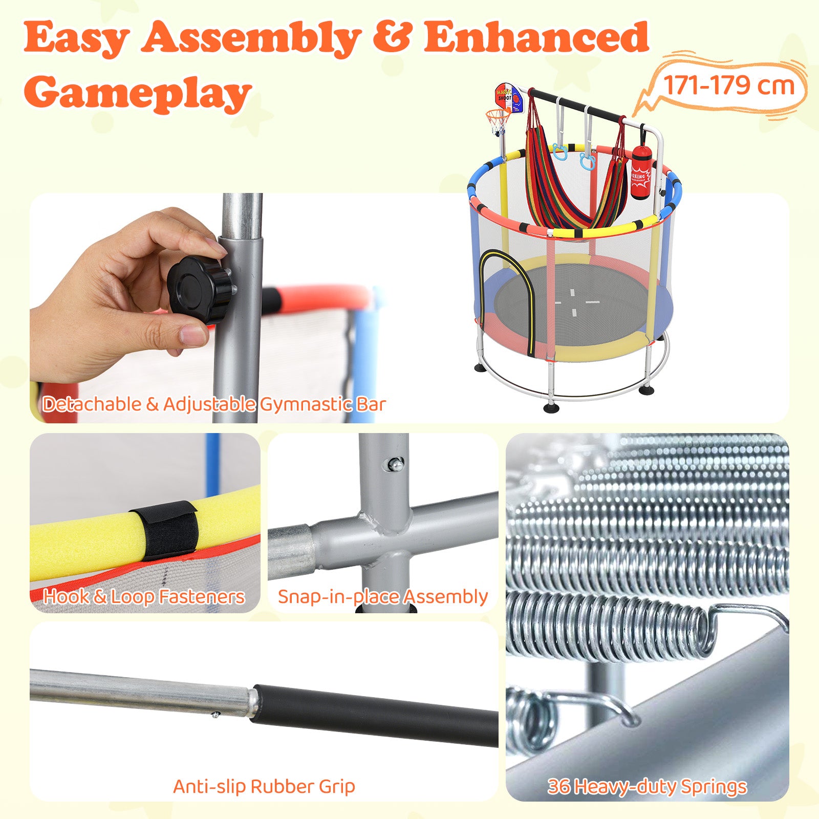 - 6-in-1 Kids Trampoline: More than just bouncing, our 55†kids trampoline offers an all-in-one fun center for your active little ones. It comes with an adjustable gymnastics bar, allowing you to add fun accessories like a boxing bag, a hammock, 2 gymnastic rings, and a basketball hoop.