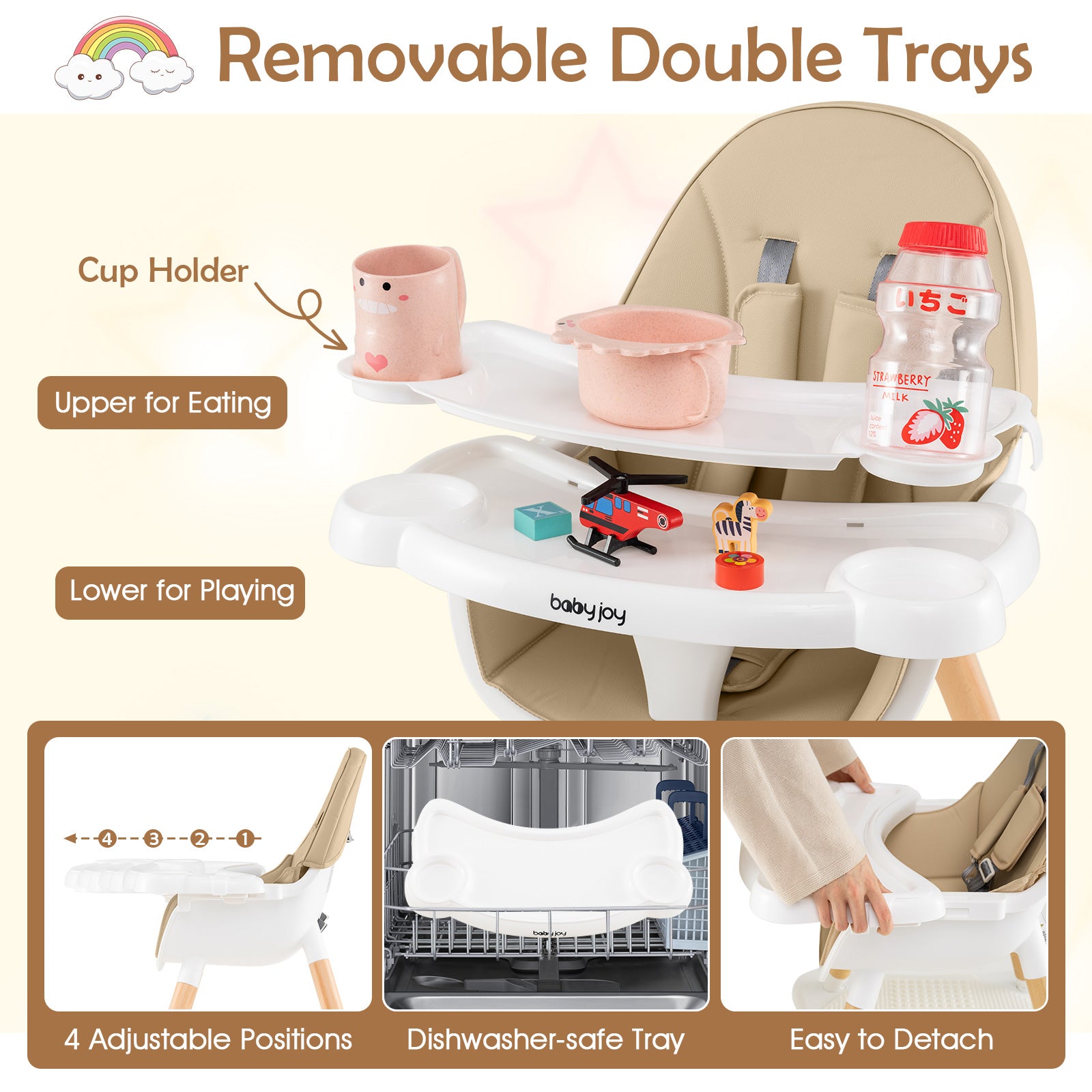 - ðŸ©Removable Double Trays: The wooden babe high chair features a dual-layer tray that caters to both dining and playtime, complete with a convenient cup holder. It offers 4 adjustable positions, providing ample activity space. Additionally, the trays are made of high-quality and BPA-free PP, while detachable and dishwasher-safe.