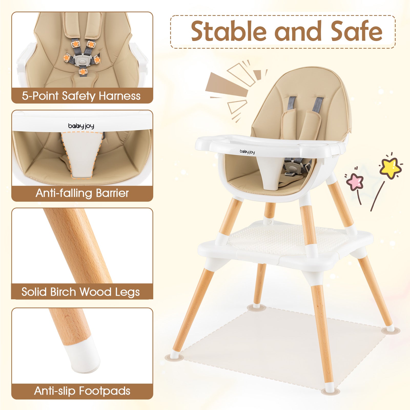 - ðŸ‘Enhanced Stability and Safety: The toddler chair is equipped with an adjustable 5-point safety harness and an anti-falling barrier, offering maximum safety. The solid birch wood legs form a pyramid structure and are complemented by non-slip footpads, ensuring a stable and safe base.