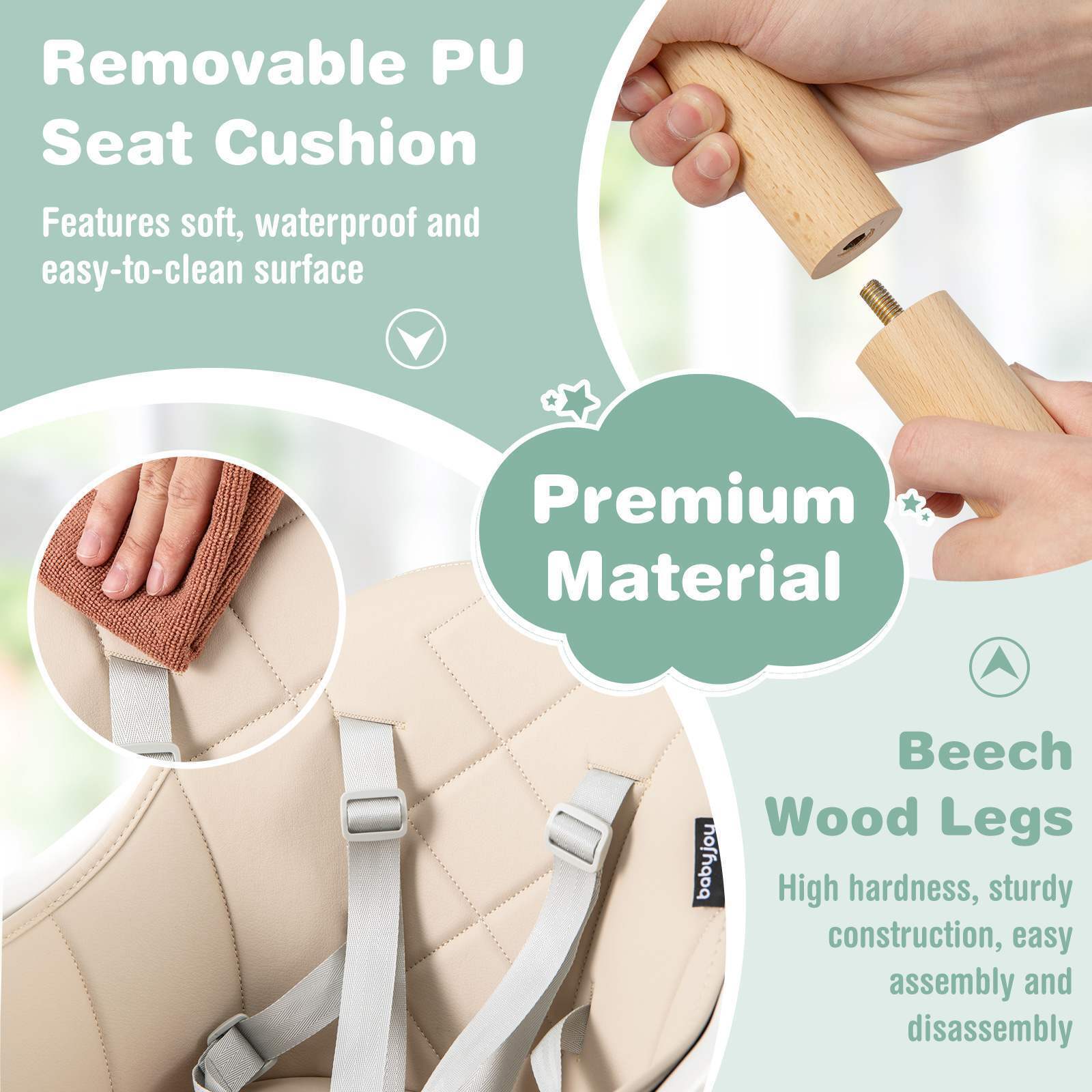 The infant feeding chair can be used as a high chair, small chair and stool in 2 different heights. The varying modes suit babies of different stages, and the max suitable age is 6 years old. Besides, the 5-point harness as well as the anti-falling baffle ensure safety. And the footrest with 2 different installation methods offers support. Supported by sturdy beech wood legs, the toddler high chair holds up to 25 KG. And the extended legs with anti-slip foot pads enhance stability. The PP trays are BPA-free for safe use and dishwasher safe for time-saving cleaning. Likewise, the waterproof seat cover is easy to clean with a rag. More importantly, kids’ necessities can be put on the storage shelf for easy access.