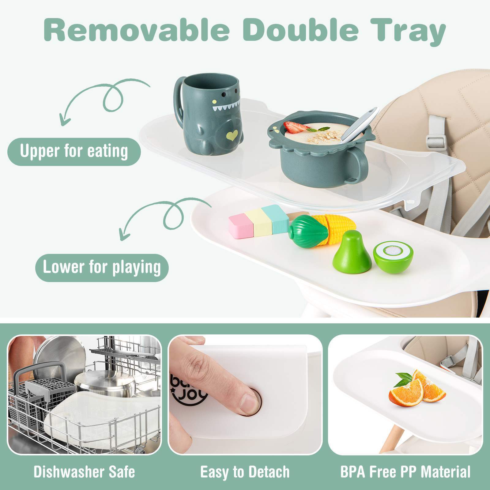 - Double Removable Trays: The double trays provide different storage for food and toys. Made of PP material that is BPA-free and heat-resistant, the trays are child-friendly. Additionally, you can put the tray to the dishwasher to free your hands for great convenience.