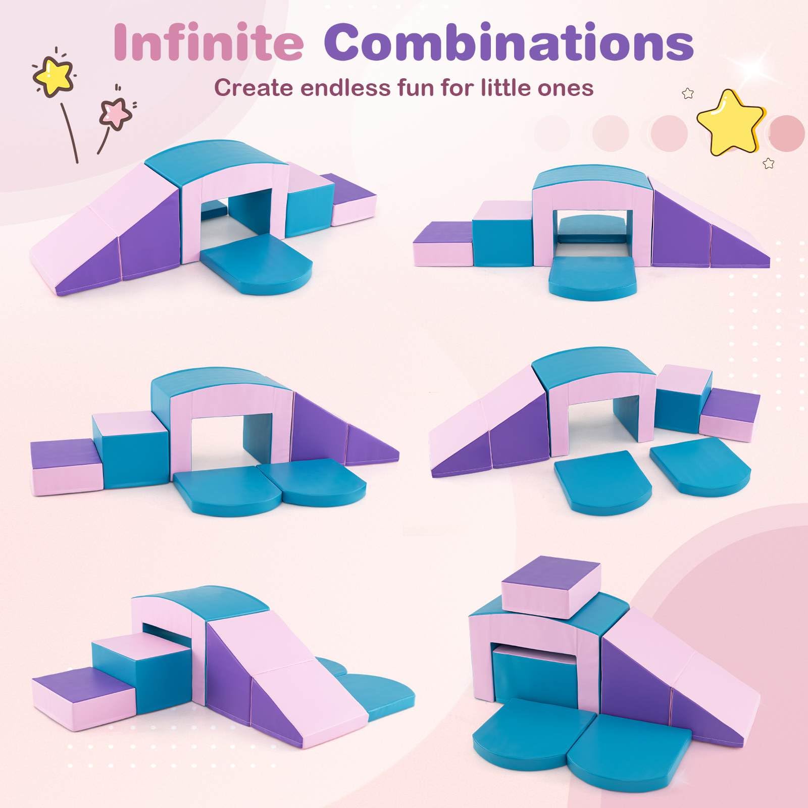 - Infinite Combinations: This 6-piece foam blocks set includes 1 x arch, 1 x large rectangle, 1 x small rectangle, 1 x triangle and 2 x fan-shaped, which can be arranged in different configurations, keeping the play fresh and engaging. The convertible triangular climbing block allows kids to slide down, stand on or sit on.