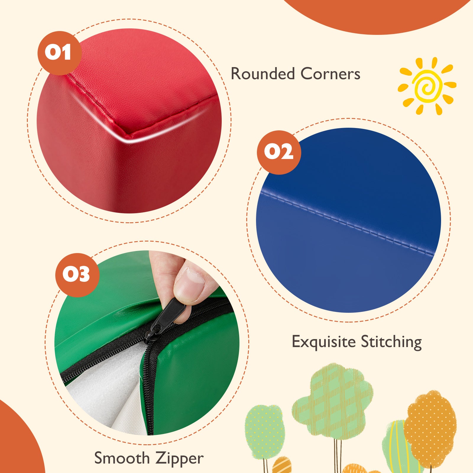The soft climbing toys are filled with elastic EPE foam for better cushioning. Covered with a high-strength PU cover, the surface is skin-friendly, waterproof, and anti-sweat. There are 2 rectangles, 1 wedge, a cylinder, a half-moon and a concave. Thus, babies are able to make various combinations with their infinite imagination and creativity. In addition, the lightweight design enables kids to move and stack these soft foam play structures easily. Furthermore, the bright colors and different shapes will help toddlers develop good color perception and cognitive ability. They can play with friends to improve their friendship or with parents to promote parent-child interaction.