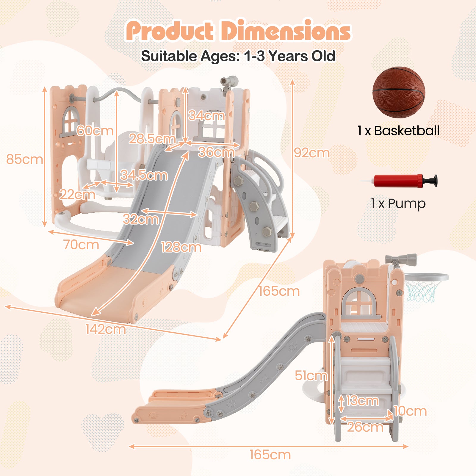 - Includes telescope, climber, slide, swing, basketball hoop, hiding spot, and storage space