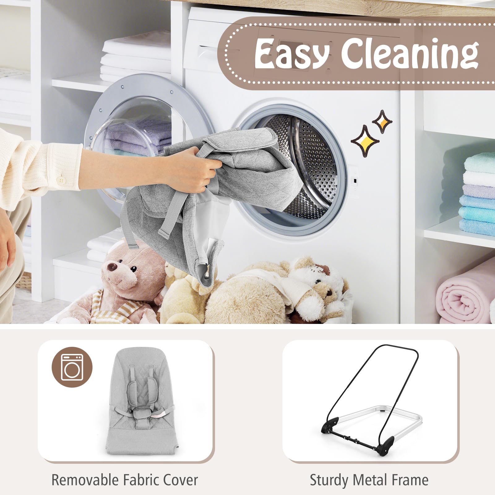 Featuring a natural bouncing based on babies’ movement, the baby bouncer soothes infants well. Besides, the ergonomic seat offers firm support for the body for comfort. With sturdy metal frame and stable U-shaped aluminum base, the baby rocker stands steadily. And the 5-point harness keeps babies always safe. What’s more, the detachable toy bar with 3 adorable toys appeals to little ones a lot. The foldable & lightweight design is friendly for storage and transport. Furthermore, the seat cover can be removed for easy cleaning.