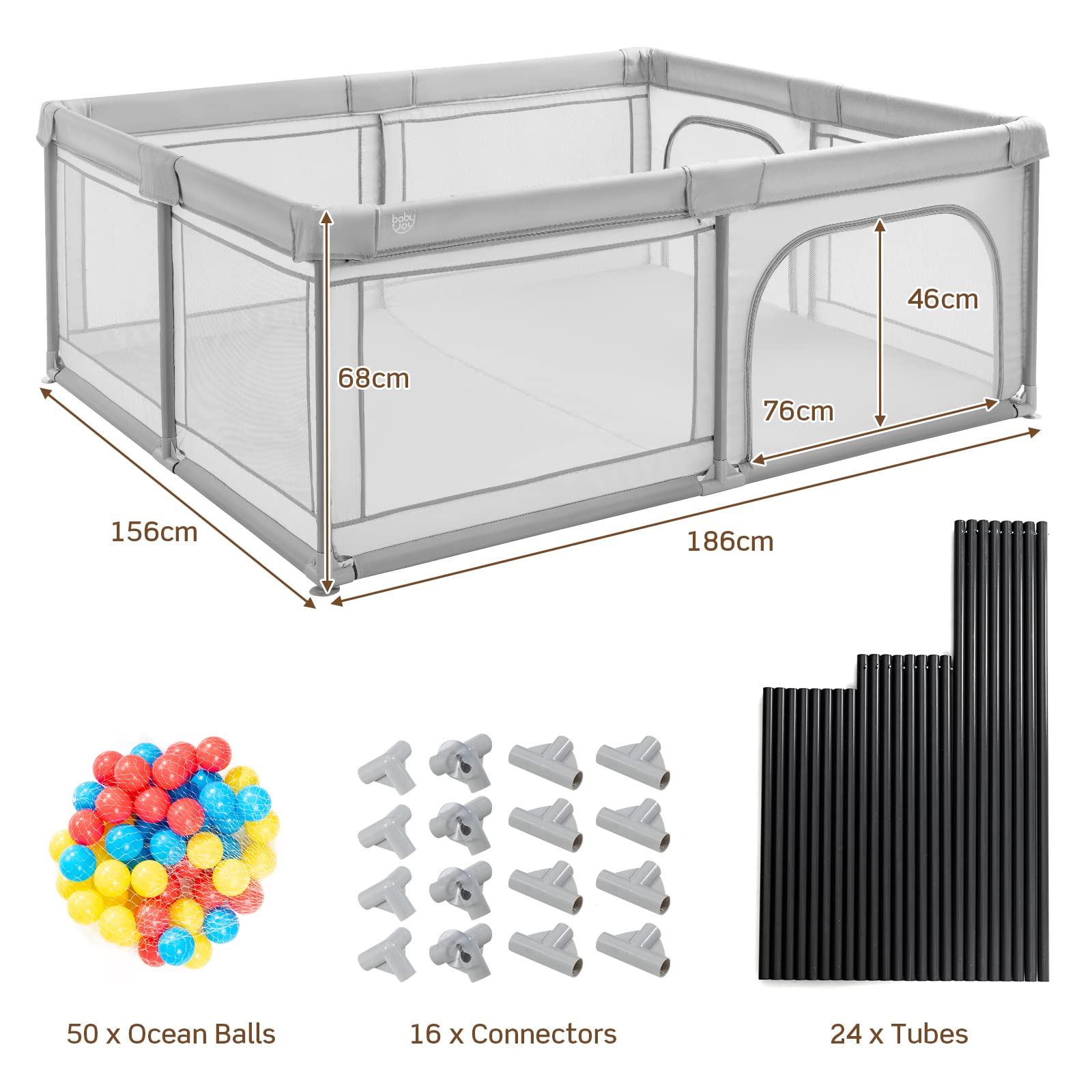 • Large Playing Area: Measuring 186 x 156 x 68 cm (L x W x H), this baby playpen provides baby with sufficient space to play, take a nap, crawl, stand, walk and even run, without a sense of restraint. At the same time, the large playpen allows several toddlers and parents to share happiness together.