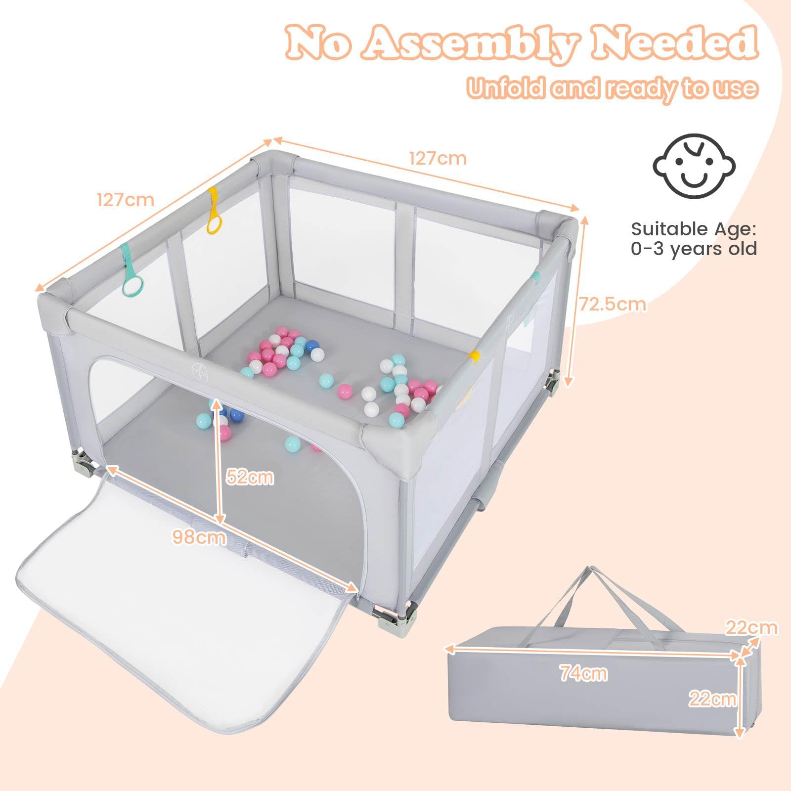 - Spacious Play Area: This large 127 x 127cm playpen provides your baby roomy safe space to crawl, walk, stand, and play freely. It’s designed for children up to 3 years old.