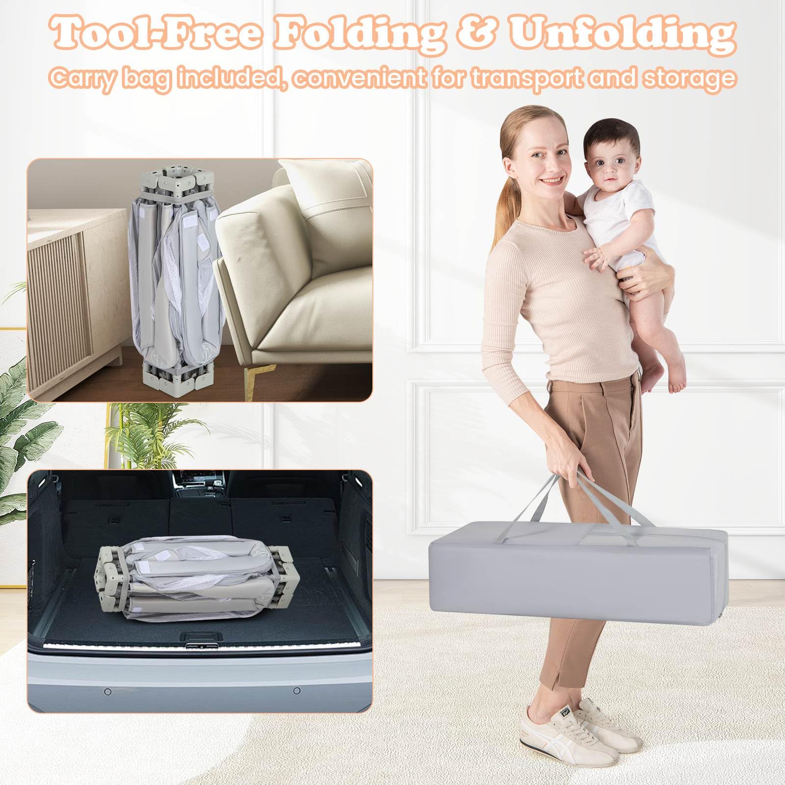 - Foldable & Portable Design: No assembly needed when you receive this playpen. It sets up and folds down simply. It comes with an included carry bag, convenient for transport and storage. Whether at home or at a picnic, this versatile playpen is your go-to solution for safe and contained play.