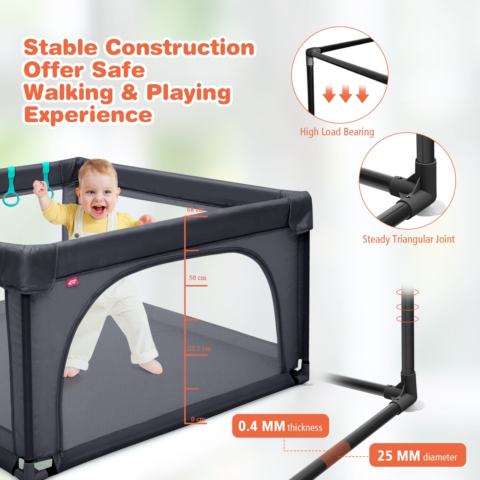 - Large Play Area & Scientific Height – The playpen creates a large area for toddlers do different activities. They can play or walk in it and the 2 pull rings can help baby to stand and learn to walk. In addition, the height of this playpen is 68cm and babies cannot climb out of it.