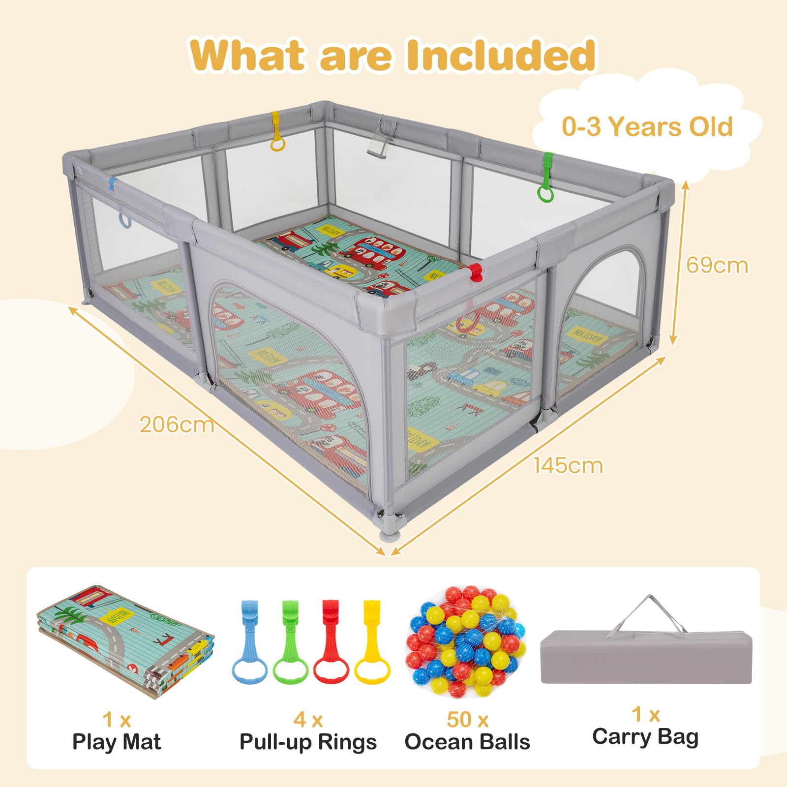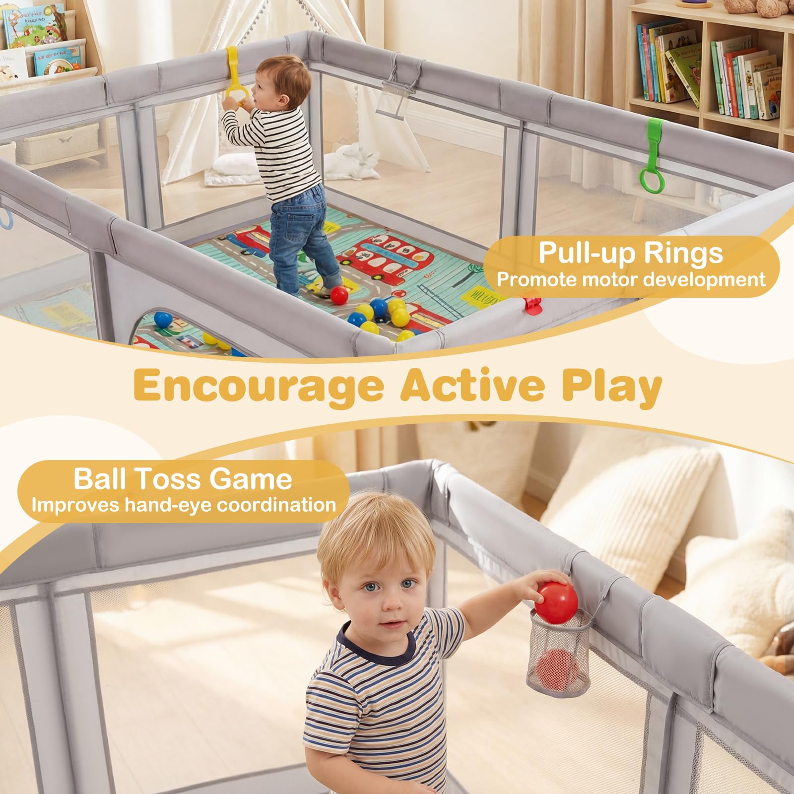 Simple to Assemble & Move:Â Equipped with a clear instruction, this large baby playpen is easy to put together. More importantly, it is easy to disassemble and carry with the provided carry bag, which offers great convenience if you need to go out.