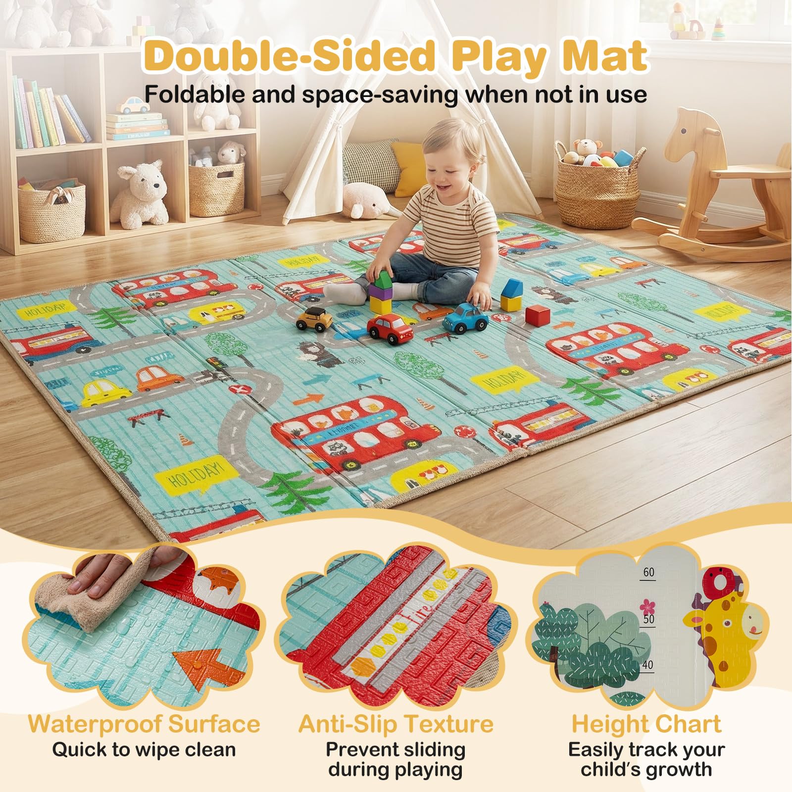 Comfortable & Foldable Mat:Â The premium XPE mat fits well with the baby play yard. Likewise, you are able to use it separately and 2 sides are designed with different patterns. The non-slip and waterproof surface features good cushioning for safe use. When not in use, the mat can be folded easily.