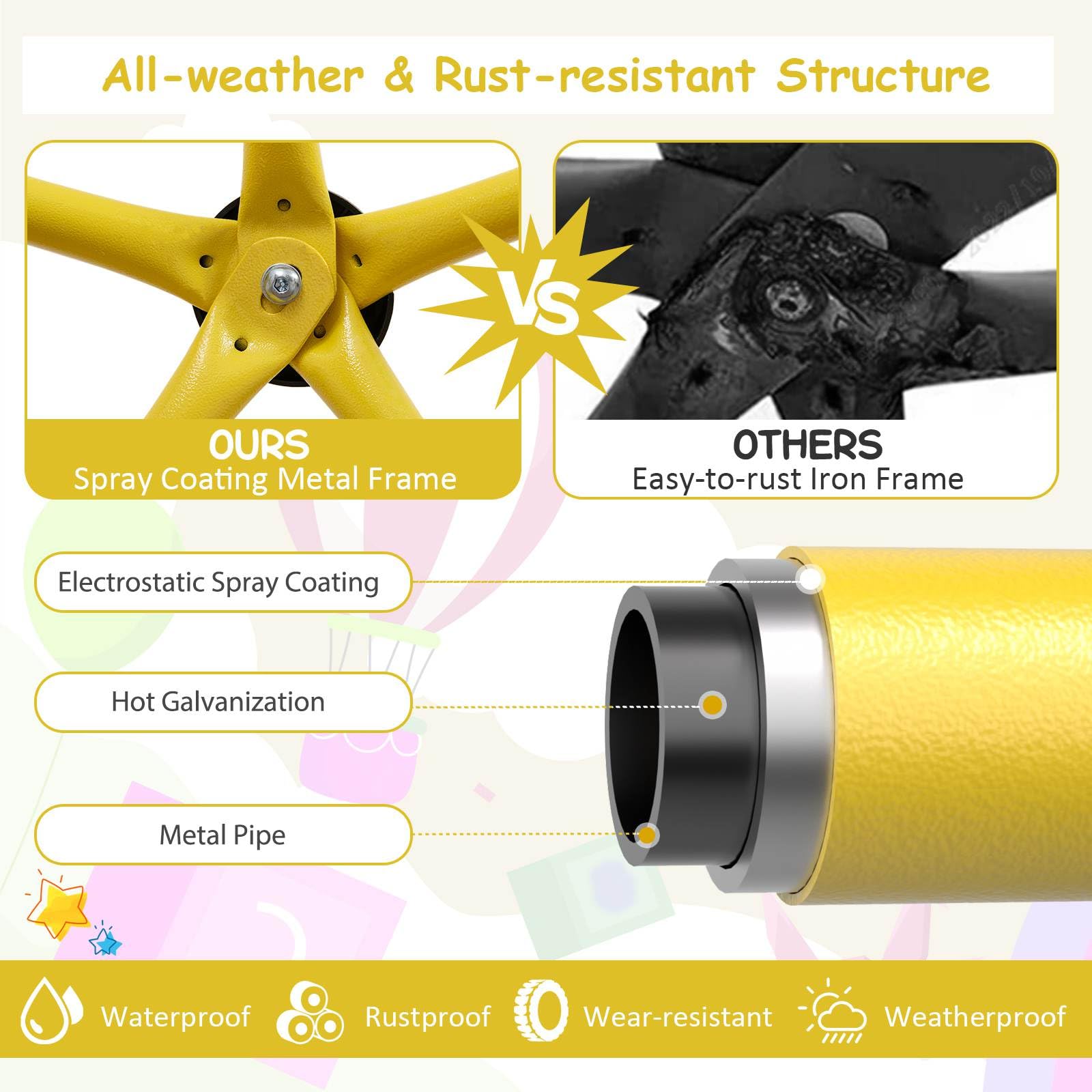 The climbing dome with swing is large enough to accommodate 1-4 kids. Its load capacity is 363 kg. Kids can enjoy the fun of climbing with their friends. With the internal swing, kids can pretend to fly in a safe area. Besides, kids are able to gain motor skills, balance ability and hand-feet coordination while playing. It not only benefits their physical development, but can also promote their critical thinking. To offer more convenience and security, this dome climber is equipped with rock climbing handles, smooth edges and convenient climbing bars. Meanwhile, our climbing dome adopts hot-galvanized anti-rust metal pipes to keep it strong and sturdy, so that it can accompany your child for a long time.
