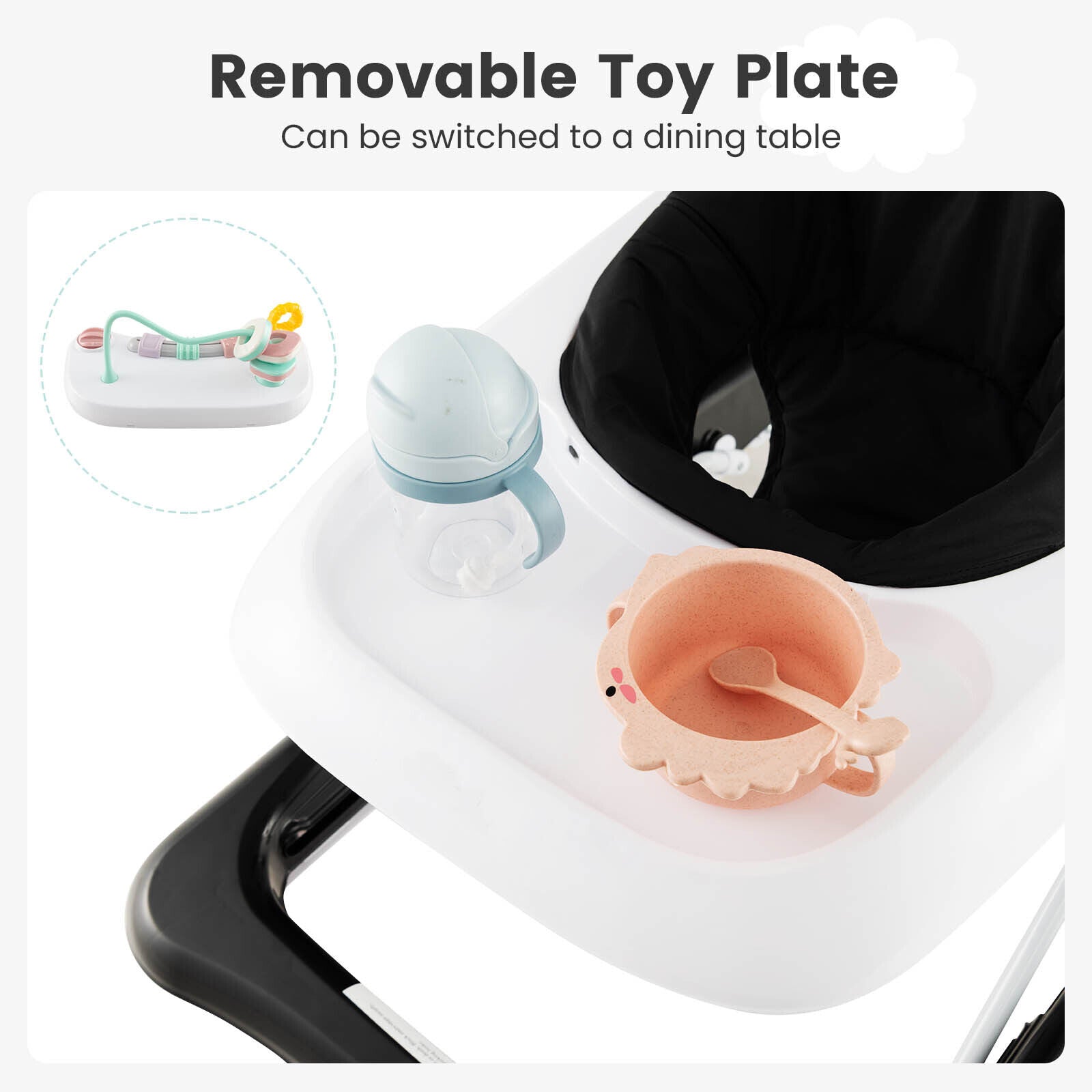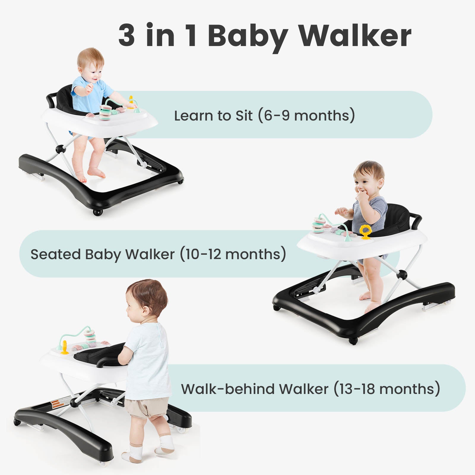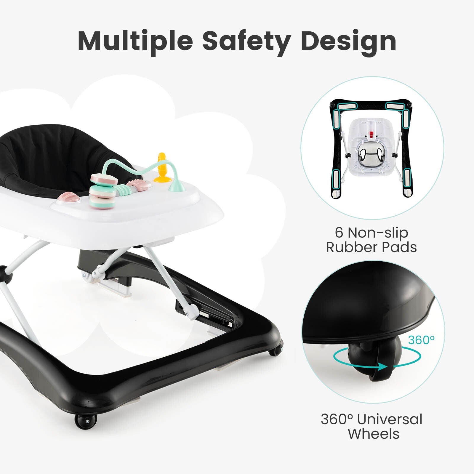 This foldable baby walker is a versatile and safe option for your little one’s early steps! This walker transforms into 3 different modes – a baby walker, a fun-filled activity center, and a secure push-along toy. This 3-height adjustable baby jumper supports their development at every stage. Safety and comfort are our top priorities. The walker for infant features a stable base and 6 anti-slip pads, providing excellent balance to prevent accidental tipping. The washable padded seat offers maximum comfort, allowing your baby to explore and play for extended periods without discomfort. Additionally, activity walker designed with interactive toys, stimulating baby’s senses and encouraging cognitive development.