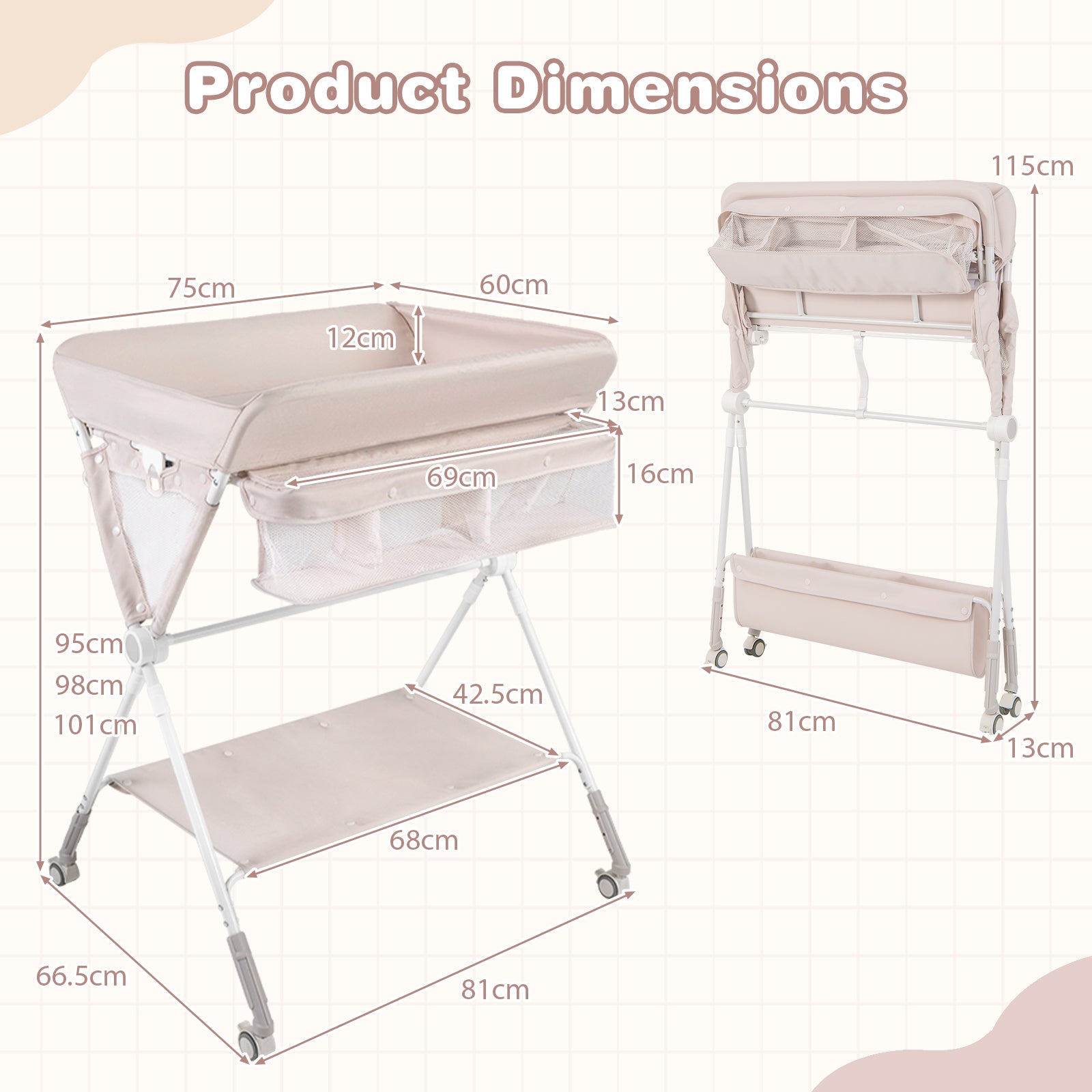 - Unfolding Dimensions: 81 cm x 66.5 cm x 95-101 cm (L x W x H)
