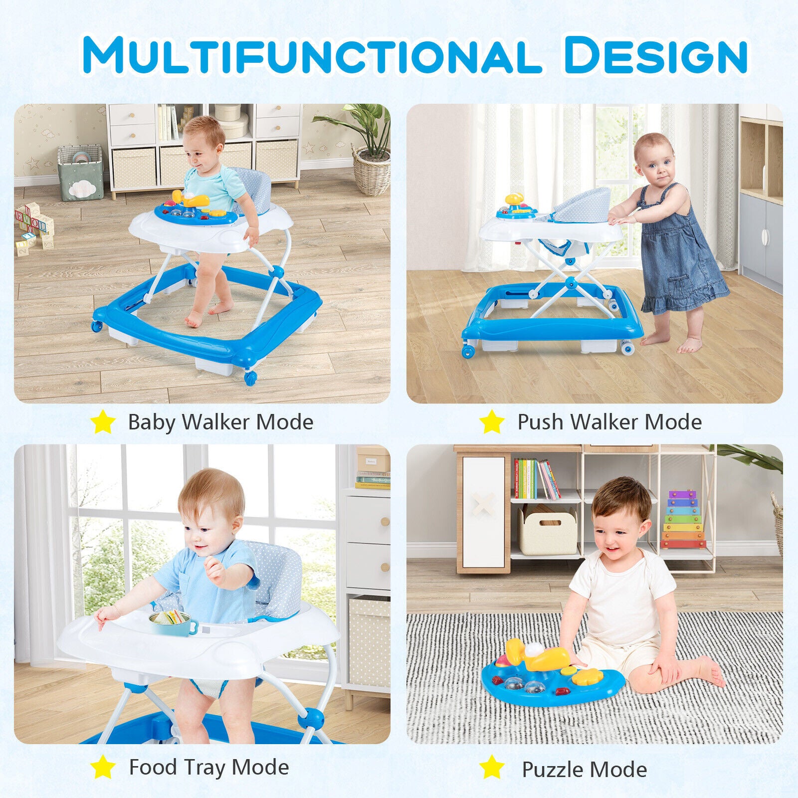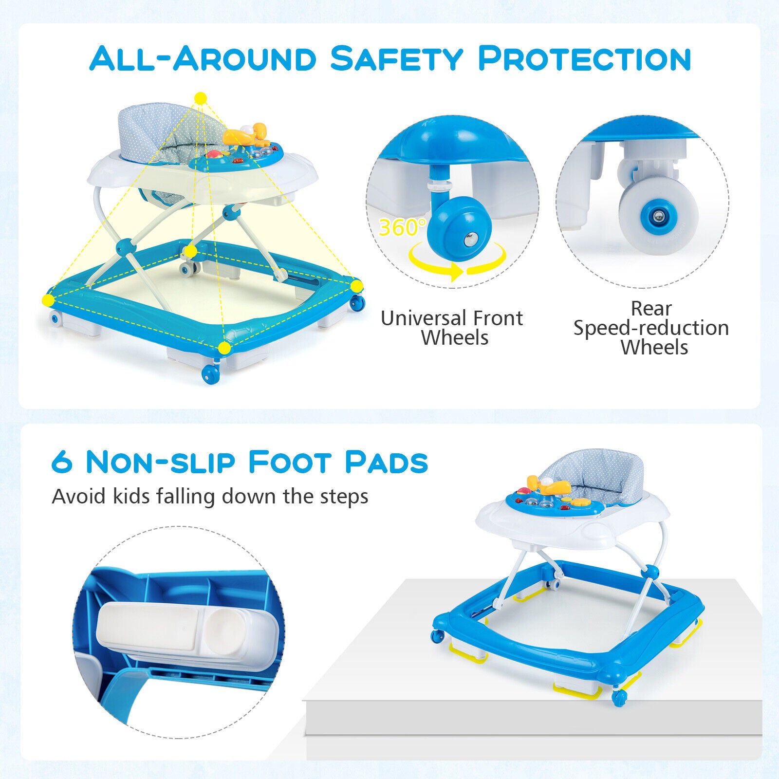 Make your baby’s journey to walking an enjoyable adventure with the foldable baby walker. Featuring 3 adjustable heights, this toddler walker provides the optimal height for your baby, which prevents the development of bow legs. With a plush padded seat and a music tray with lights, this walker offers comfort and interactive playtime. Safety always comes first. This baby walker is equipped with non-slip foot pads to increase stability when accidents happen. Plus, the ample safety distance protects your baby from pinching hands. The foldable design allows for easy storage and transport.