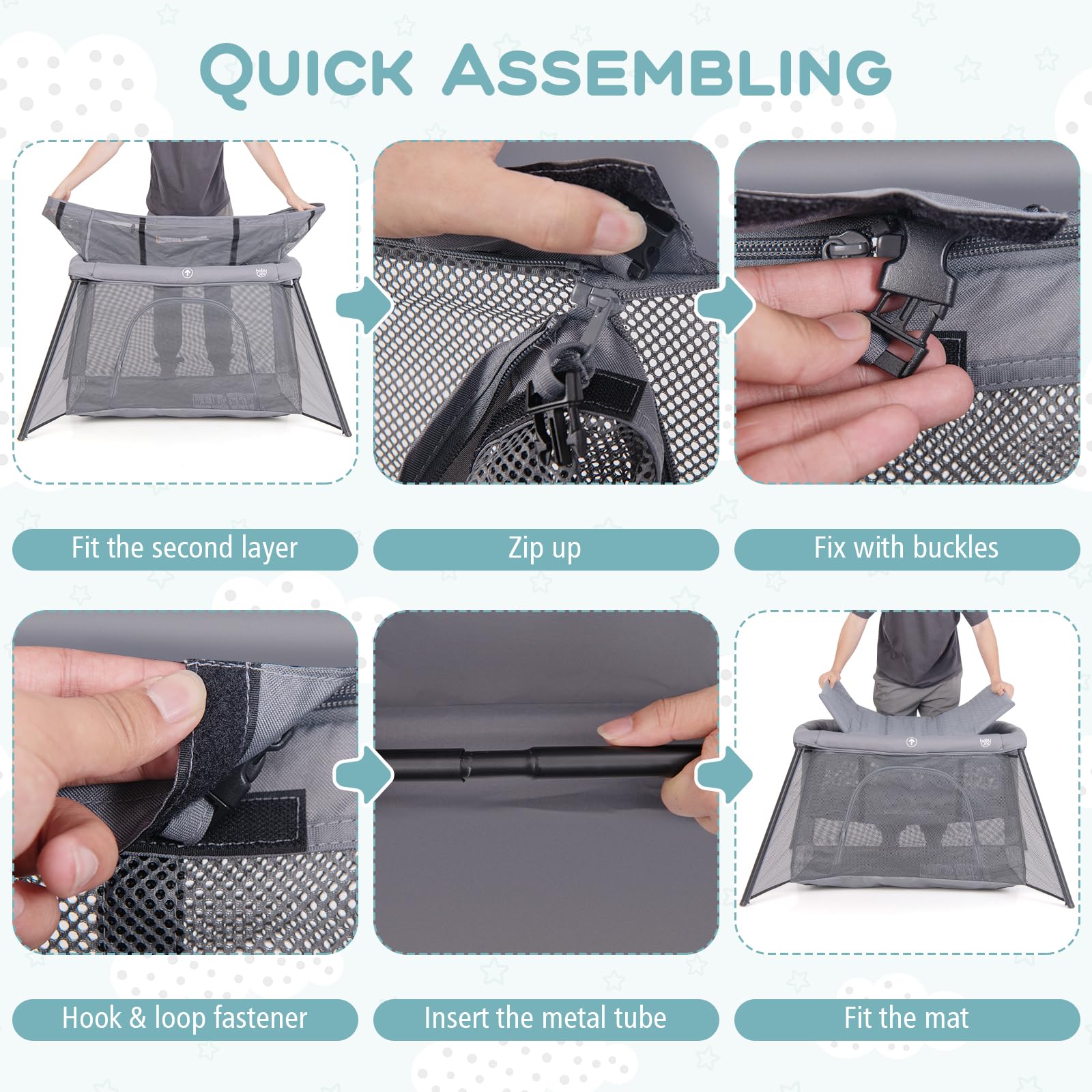 - 👶ã€Quick & Easy Setup】Set up this travel crib effortlessly without any tools and provide a secure environment for your baby in minutes. Ideal for busy parents on the go, the intuitive design ensures you’re ready for naptime or playtime wherever you are.