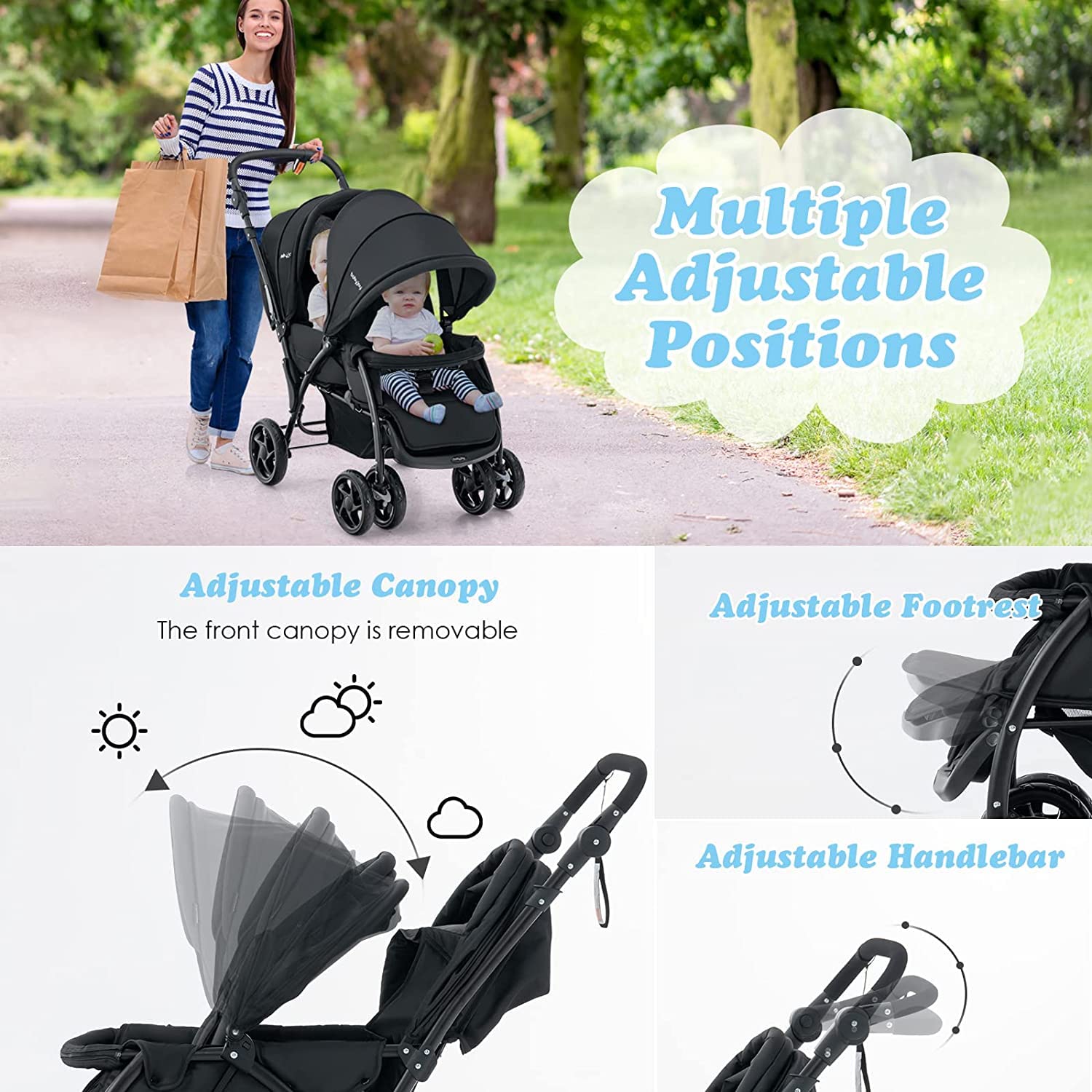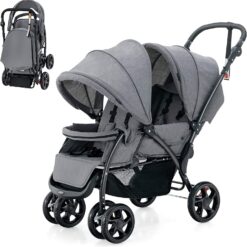 Constructed of a strong and heavy-duty frame, the baby stroller provides a reliable use in the long-term service. The portable design is perfect for safety and carrying. It is designed for two babies with double seats that can meet your various needs. The comfortable seat with 5 safety belts equipped is ideal for babies to wander. The wheels with shock-proof function are safe for adults to use. Also, the push handles and the foot rest is adjustable to fit your baby and babysitter. Don’t hesitate to buy one!?
