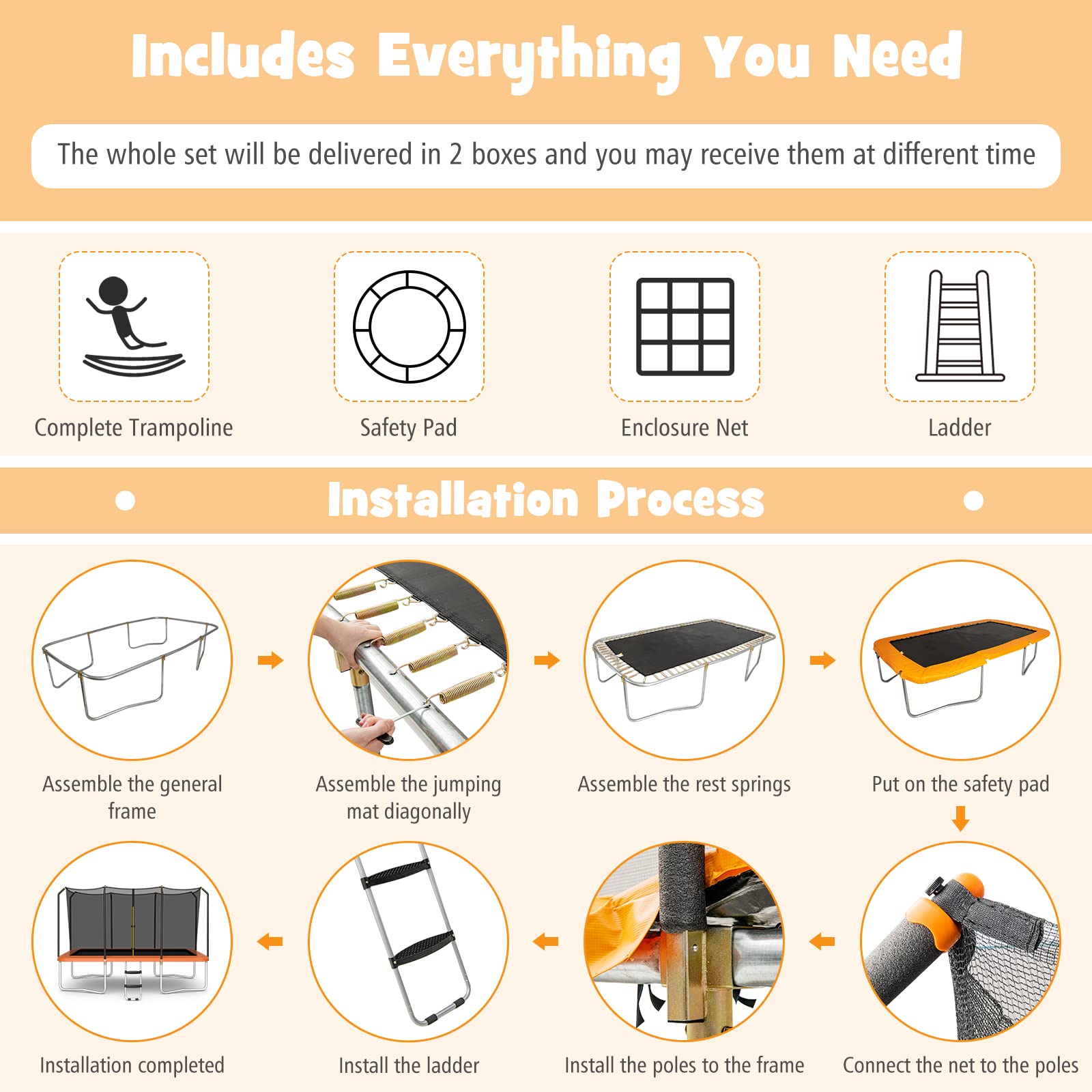 - Enjoy the Installation: This outdoor trampoline comes with all accessories, installation instructions and tools that you need. And the installation of the poles is enjoyable with lock pins, requiring no tools.