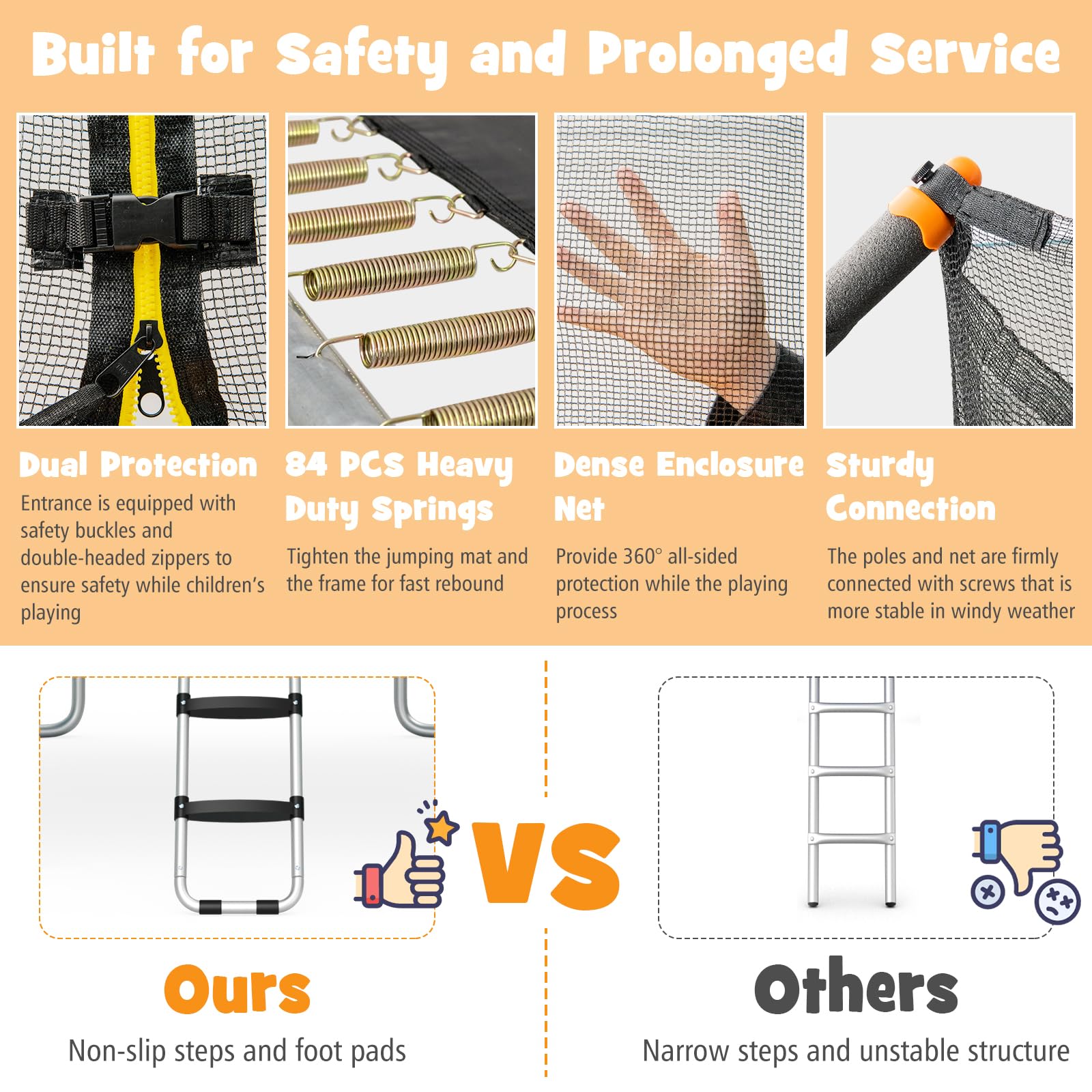 - Long Lasting & Impressive Jumping Experience: This trampoline is equipped with 84 heavy duty steel springs to connect the jumping mat tightly for outstanding rebounds. The breathable and wear resistant PP jumping mat has tested for 5000 hours of UV resistance, ensuring outstanding weather resistance for long time outdoor use.