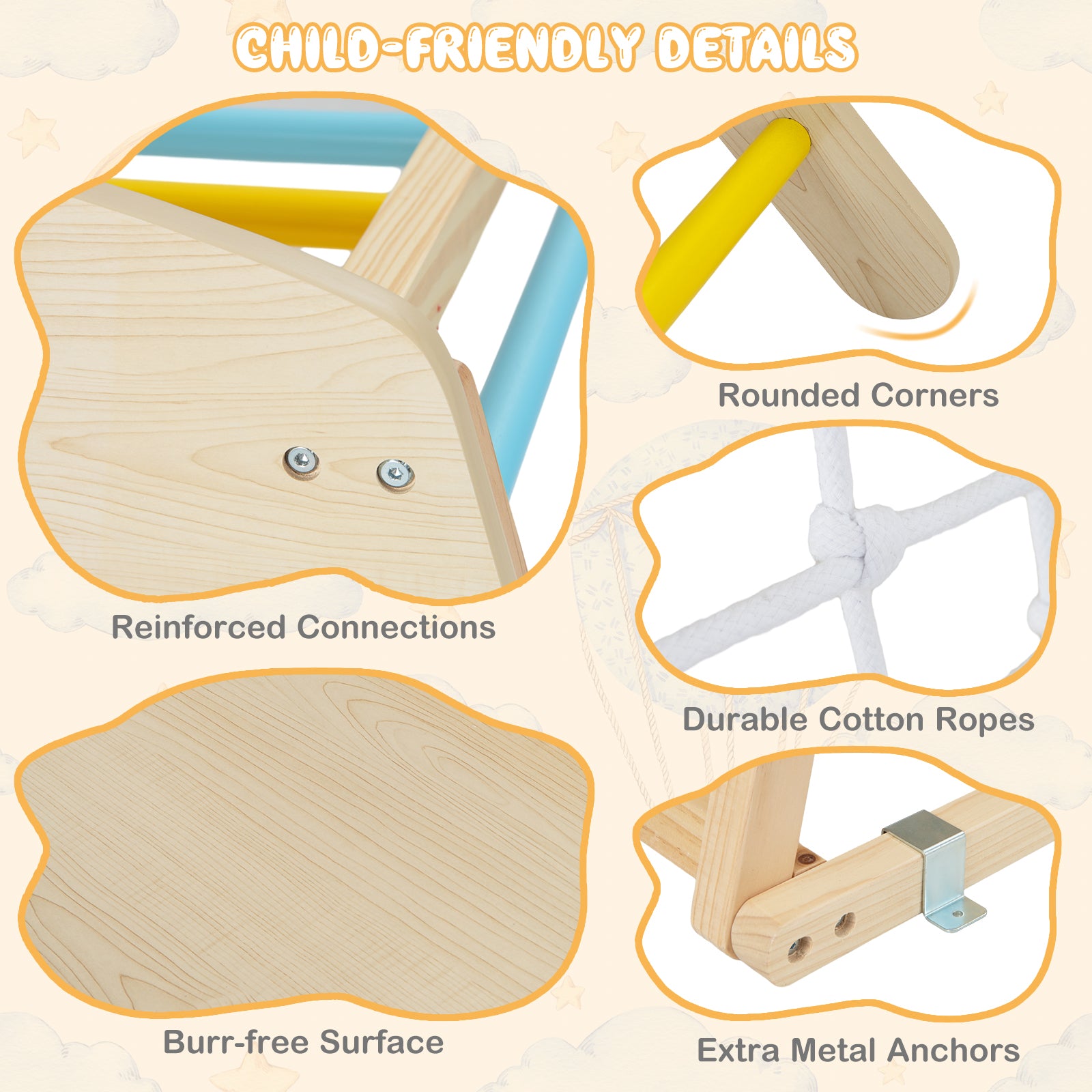 - Kid-friendly Materials & Details: The 6-in-1 indoor jungle gym is made of natural pine and beech wood that are BPA-free, durable, and sturdy. Additionally, the burr-free surface and rounded corners well protect toddlers from accidental injuries. Certified by EN71, the wooden indoor climbing set is more reliable.