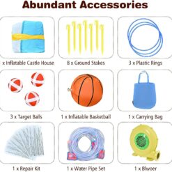 - All-In-One Entertainment Hub: Bursting with double slides, a large splash pool, and games including ring-toss, basketball, and dart, this bounce house is a kid’s dream playground come to life! It will keep children engaged and active for hours on end, soothing them with cool splashes on hot summer days.