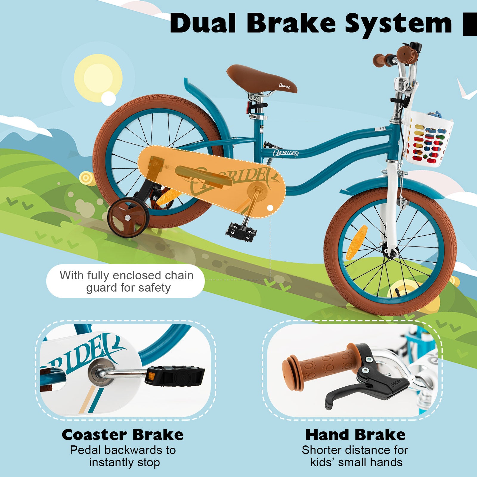 - Safe Handbrake & Coaster Brake: Our children training bicycle is equipped with dual brake system: hand brake (shorter distance for kids’ small hands) and coaster brake (pedal backwards to instantly stop). Besides, with fully enclosed chain guard for safety, the toddler bike improves kids’ riding security to a higher level.