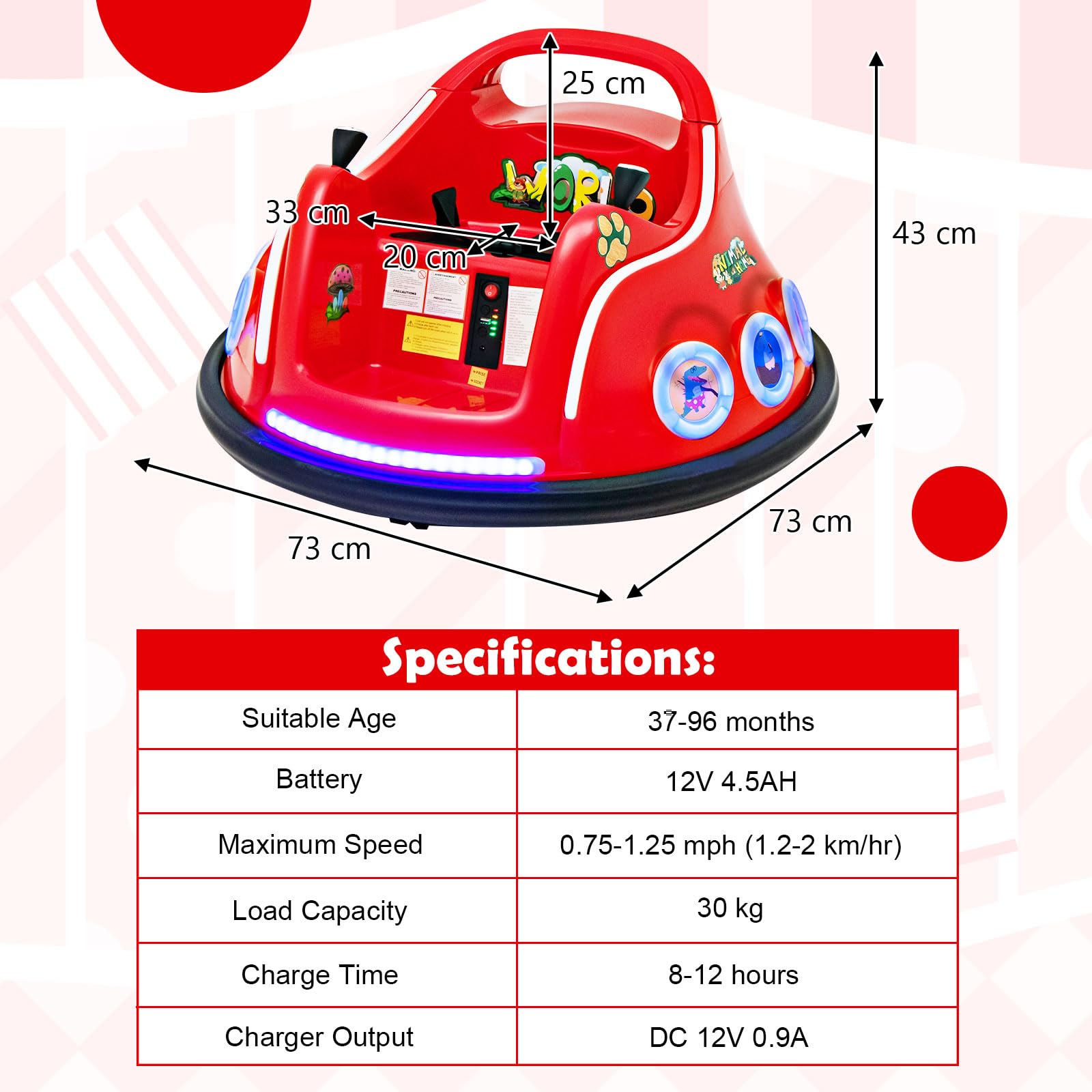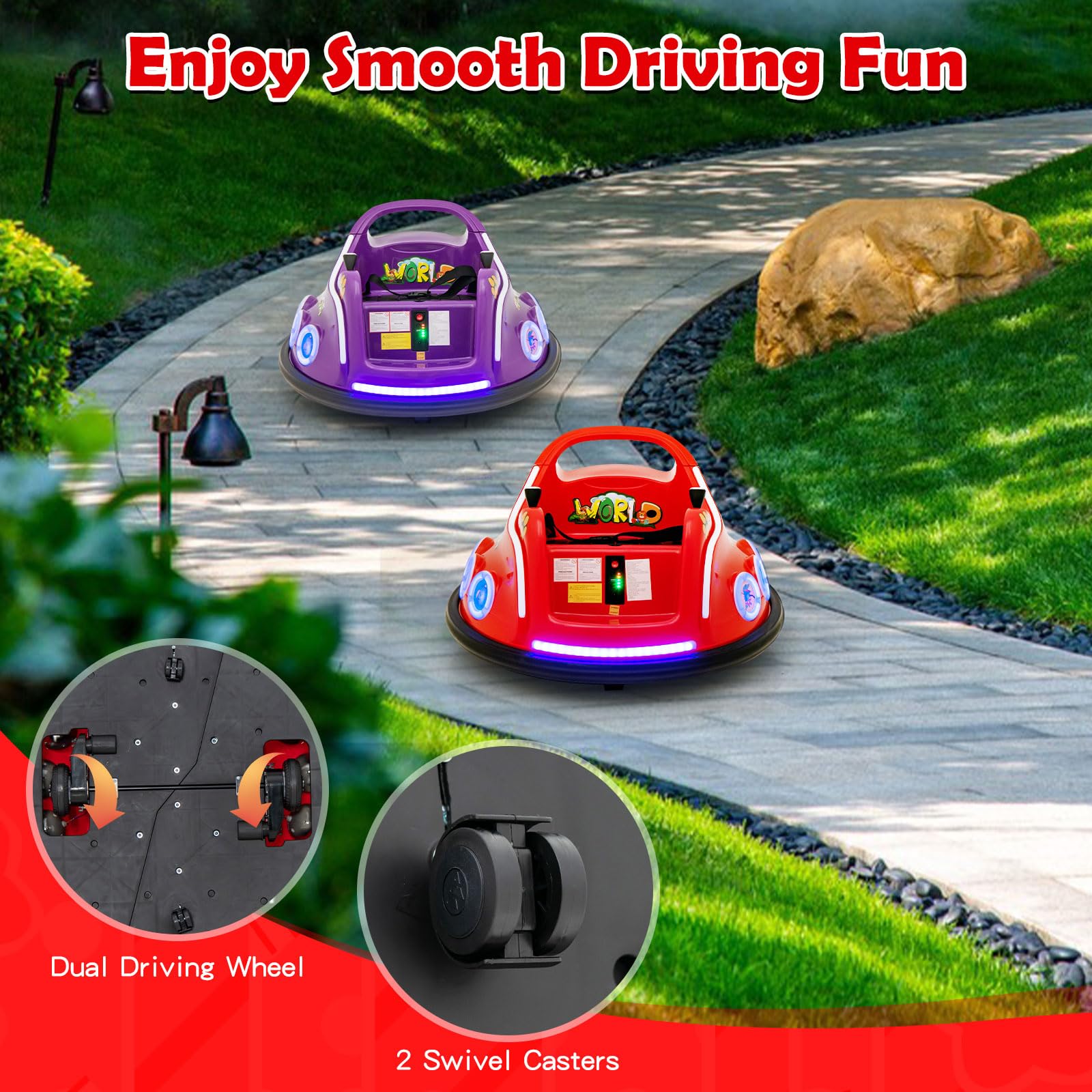 - Exciting Lights & Charming Design: Coming with the front LED light and side breathing lights, this bumper car immerses your child in a world of excitement and wonder. Moreover, with its charming cartoon pattern design, this bumper car adds an extra touch of delight to playtime.