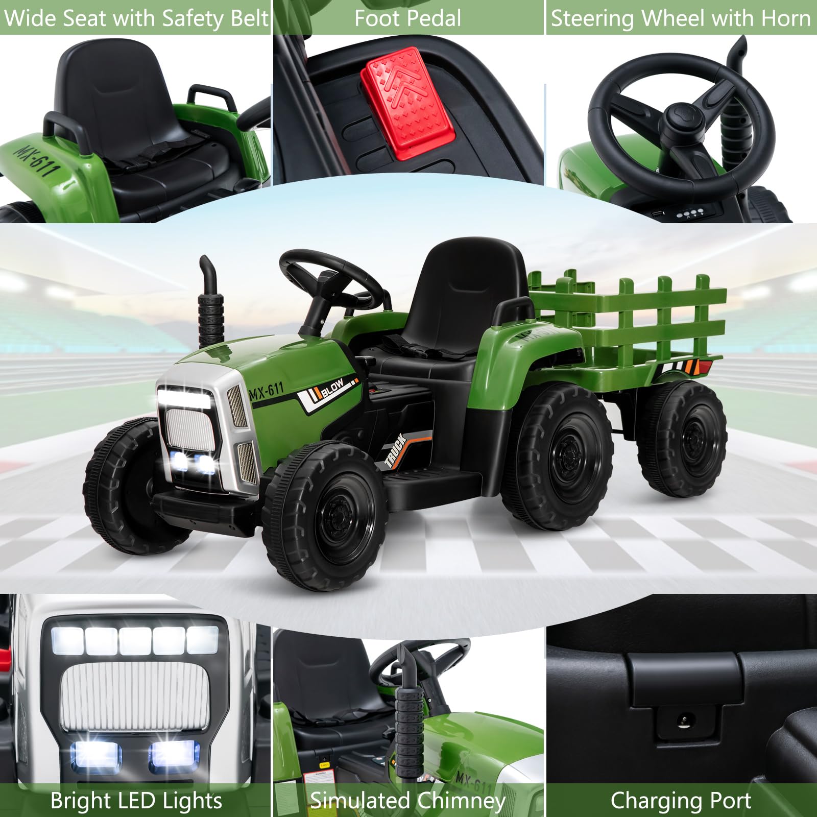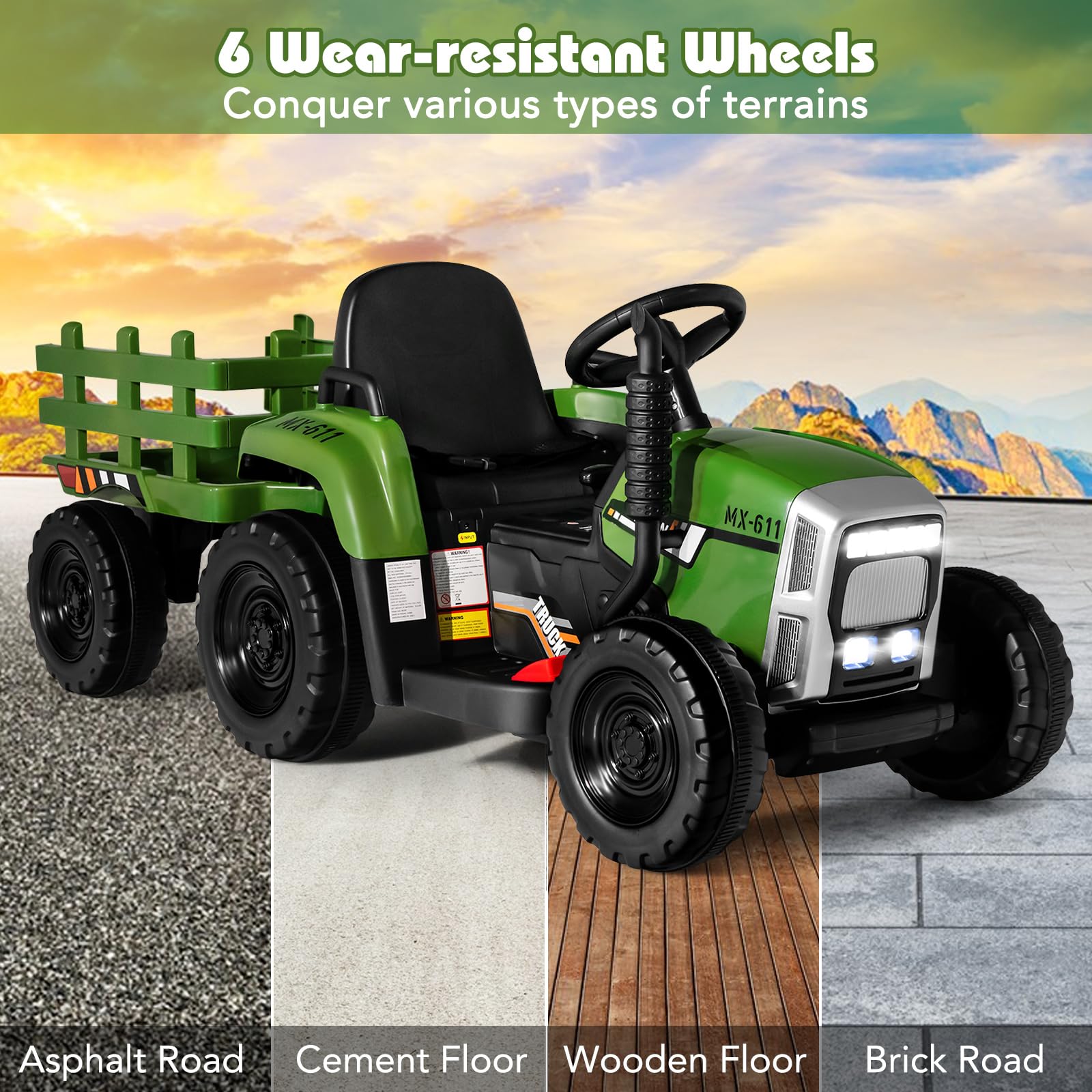 - Realistic Kids Tractor with Trailer: Our kids ride-on tractor is an ideal gift for kids over 3. It has realistic tractor outlook, bright headlights and attractive colors. Kids can use the detachable trailer to carry straws, flowers and various garden supplies for more fun. Kids can pretend to be a farmer. And if needed, you can remove the trailer by detaching the screw of the connection part.