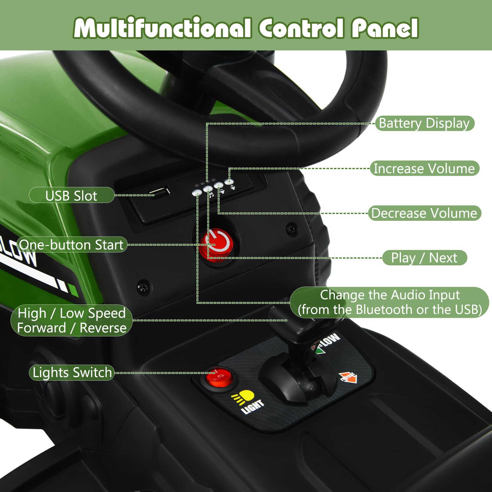 - Intuitive Control Panel for More Fun: With wireless and USB input, our vehicle plays music to bring kids much more fun. Kids can press the buttons on the control panel to adjust the music volume and play the music. Kids can hear horn by pressing the button of our steering wheel. And indicator lights will display the power level of built-in battery.
