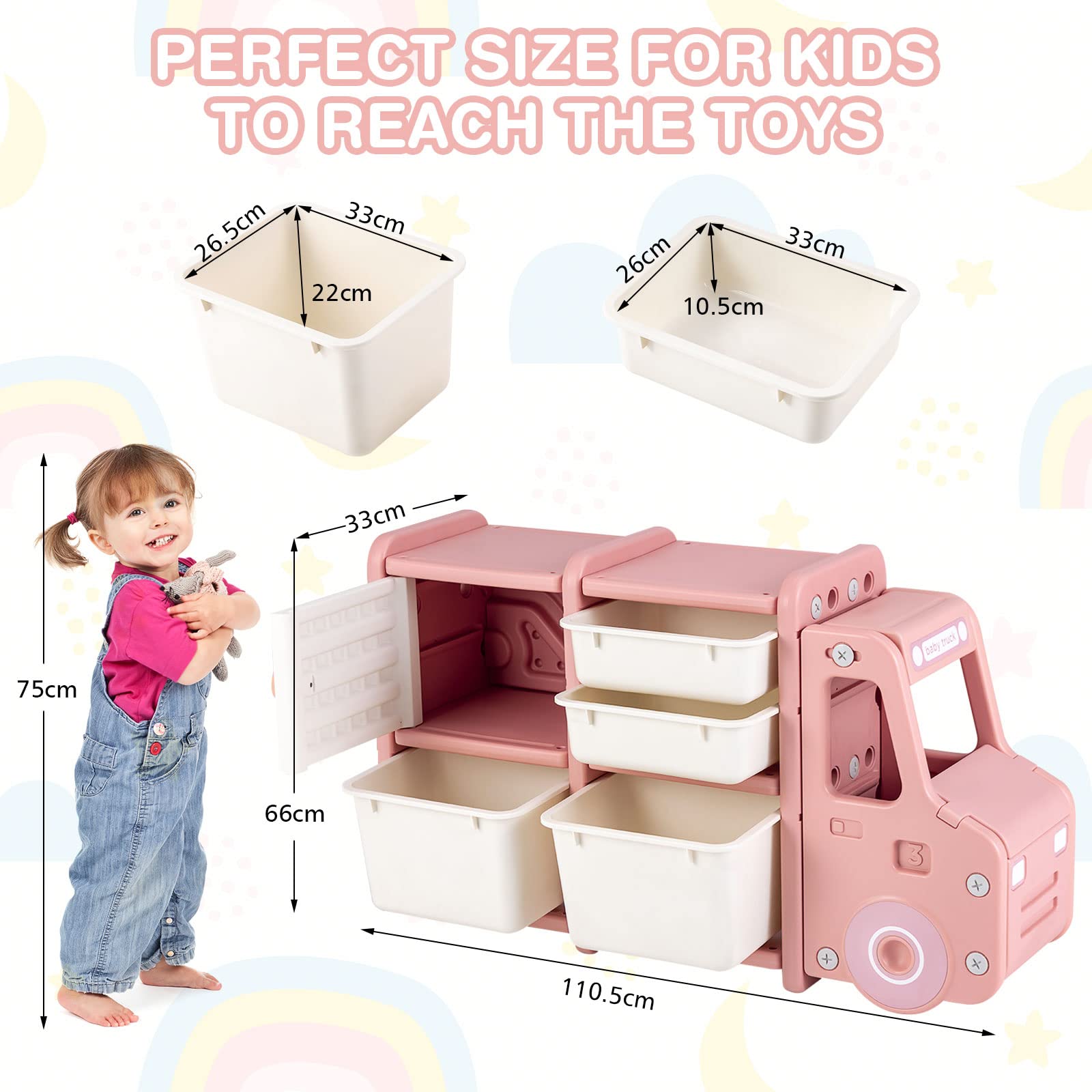 - Large Storage Capacity – The adorable toy storage organizer consists of 2 large bins, 2 pull-out drawers, a single-door cabinet and a hollow front store space, offering large storage capacity for kids’ toys, dolls, snacks, books and clothes. Besides, the hollow front store space is fitted with a detachable cover, so that you can easily put stuff inside.
