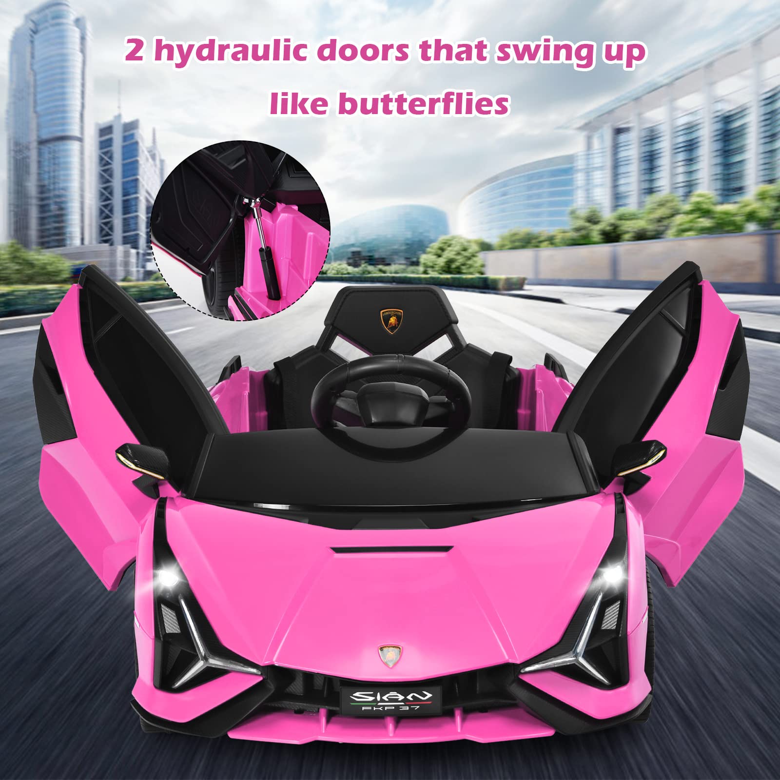 - ðŸŽPERFECT DESIGN: Lambo doors meet the imagination of children. Using simulation pneumatic levers, the doors open more smoothly. The doors turn up, allowing the kids to get on and off more gracefully. Real LED lights bring a more real driving experience to your baby. The rear of the kids’ car has hidden small wheels, which make it easy to move and carry the car.