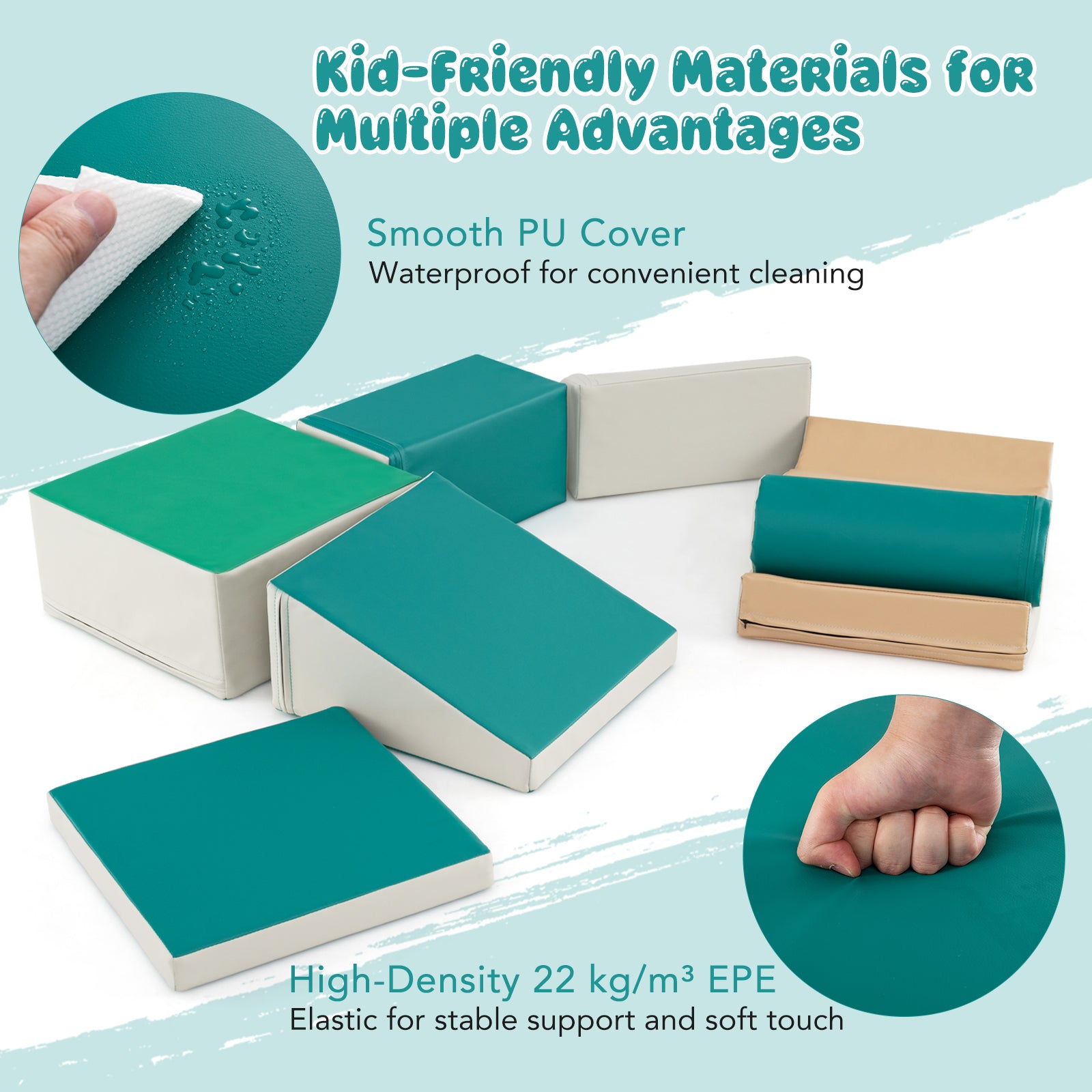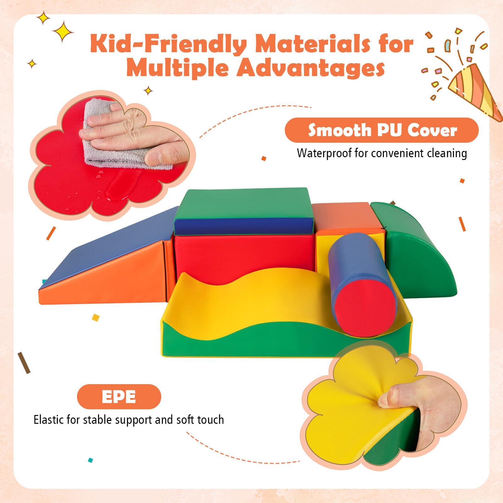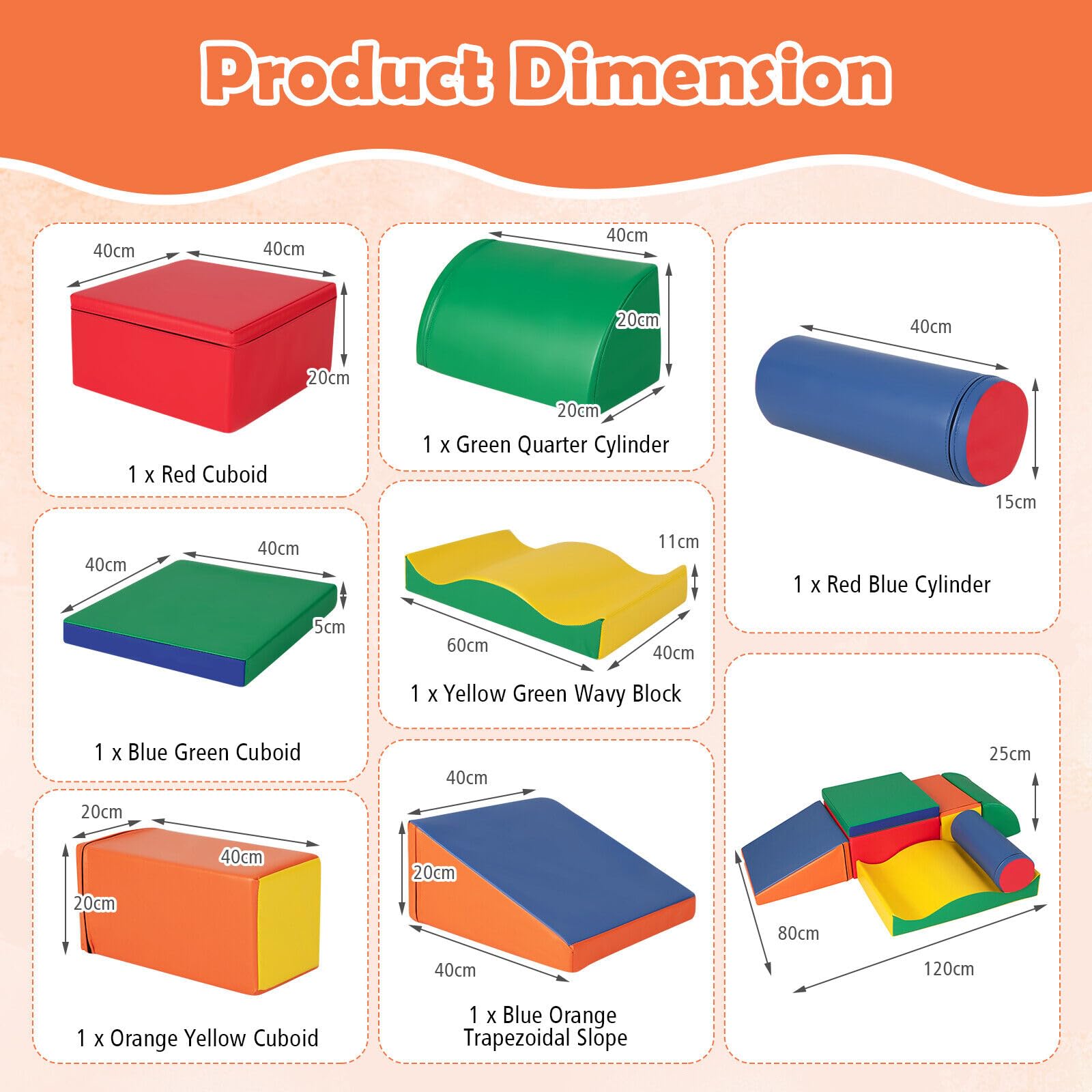 - 7-Piece Foam Block Set: The soft climbing toy set contains a quarter cylinder, a slope, a cylinder, a wavy block, and 3 kinds of cuboids. All feature different vibrant colors to attract kids and inspire their color recognition. Moreover, the entire set only weighs 4kg, very effortless for parents to move for multi-scene uses.