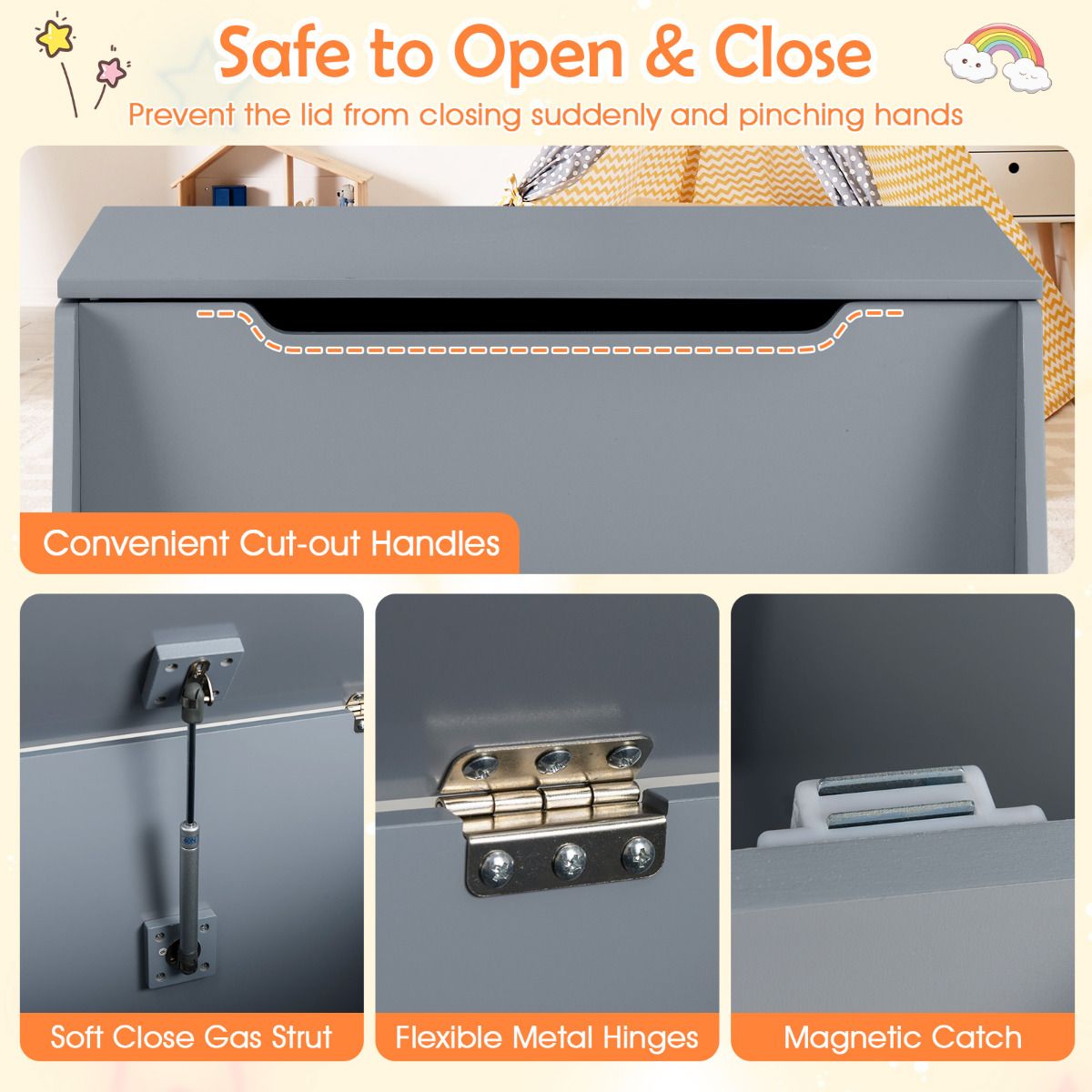 - Flip-top lid with safety hinges avoid any potential danger