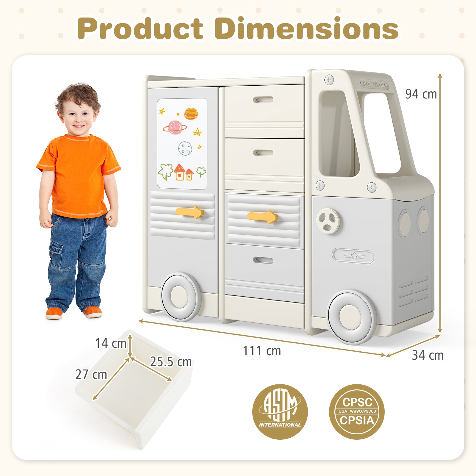 Featuring 4 drawers with handles and 2 cabinets, this storage cabinet offers classified storage space for toys, books, and art supplies. Moreover, the spacious countertop provides additional storage or play space, while the large whiteboard brings added drawing fun. Crafted from superior HDPE and PP materials, this toy organizer is child-safe and built to last. Thanks to the cartoon bus shape, it adds a fun addition to any room, inspiring imaginative play and creative storage solutions. It is ideal for playrooms, classrooms, and kindergartens. Upgrade your child’s room with this practical toy storage organizer.