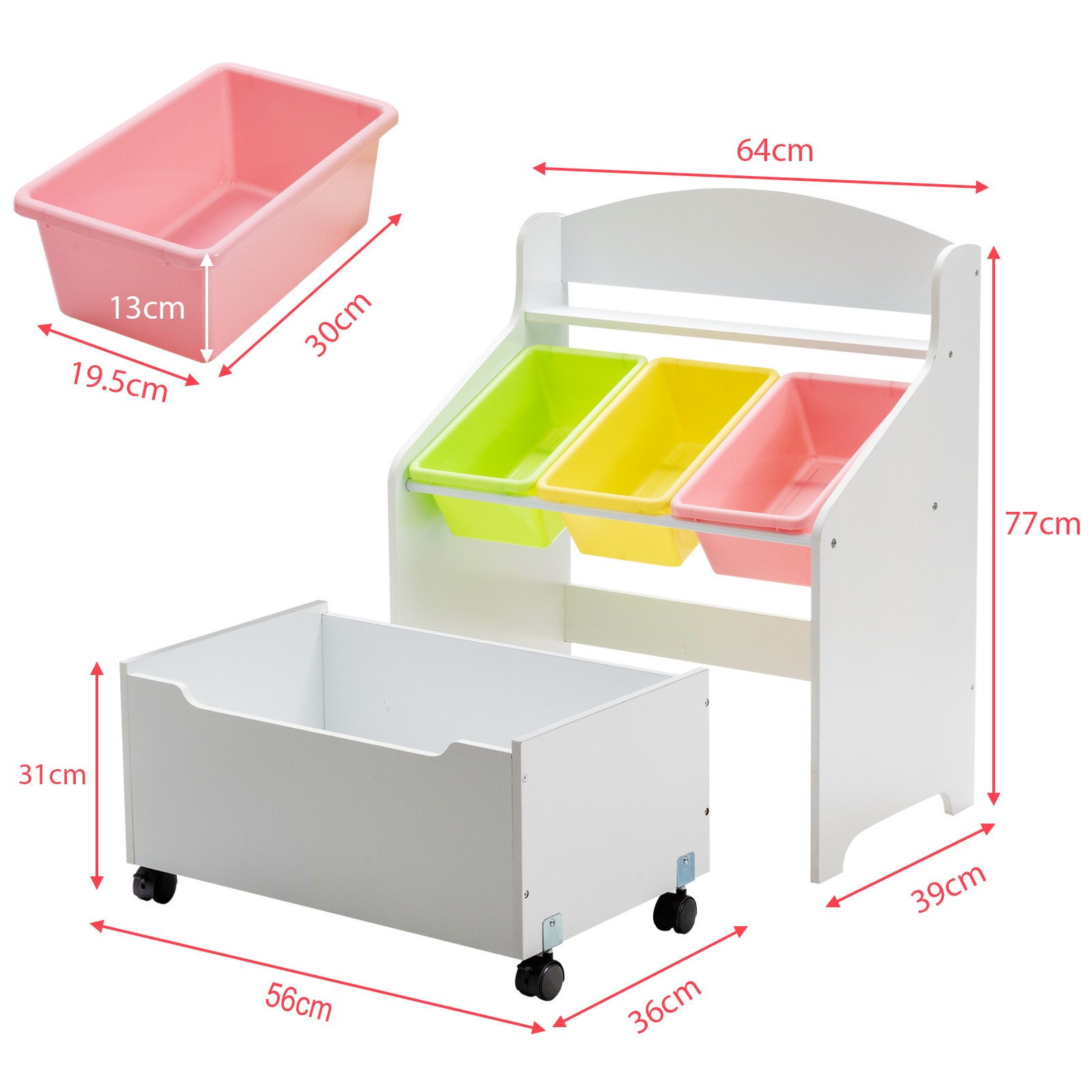 Includes 1 large capacity toy box, 3 removable plastic bins, 1 top display shelf
