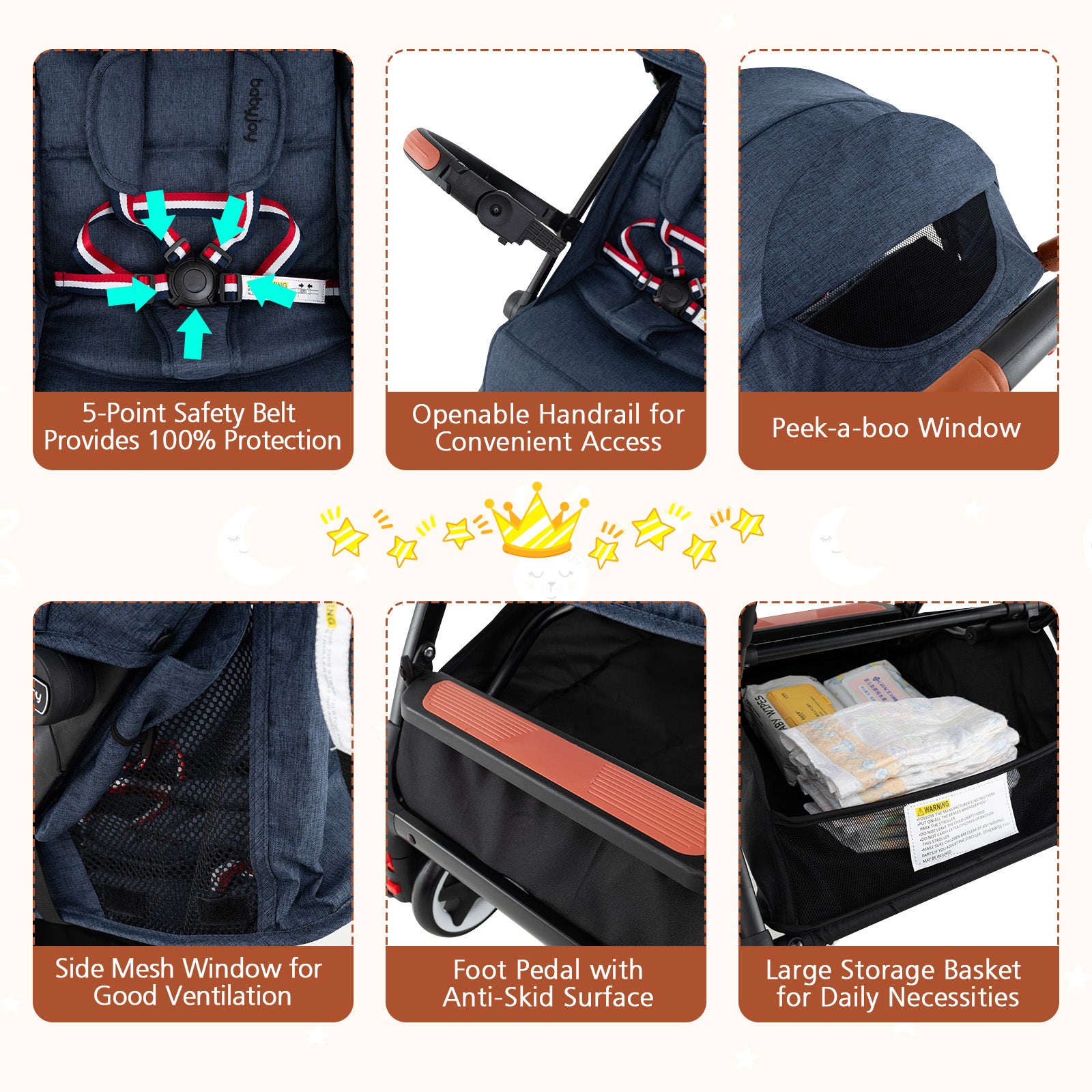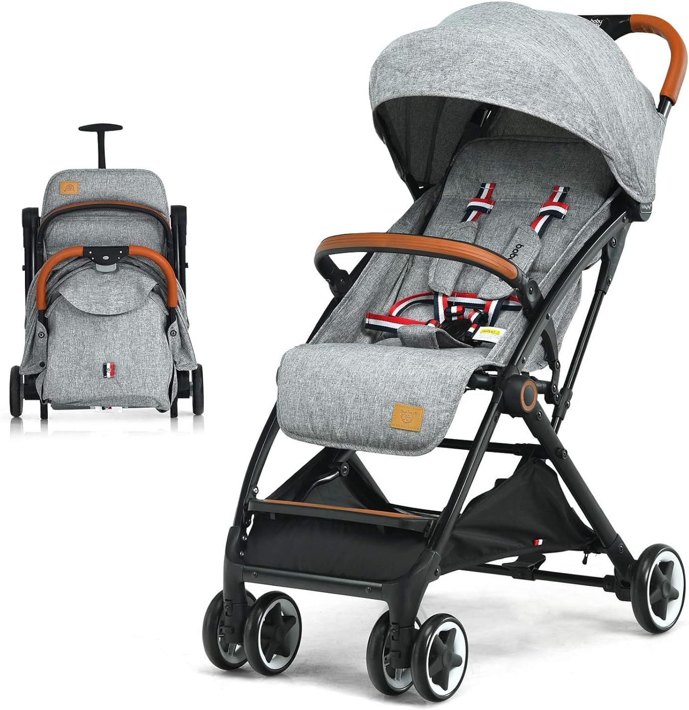 - Comprehensive Protection: Our stroller is equipped with a 5-point safety belt, which can gently but firmly fix your baby on the seat. There is a foot brake between the rear wheels, and you can stop the stroller easily when necessary. More importantly, our stroller is made of safe and odorless fabric, providing a healthy environment for your baby.