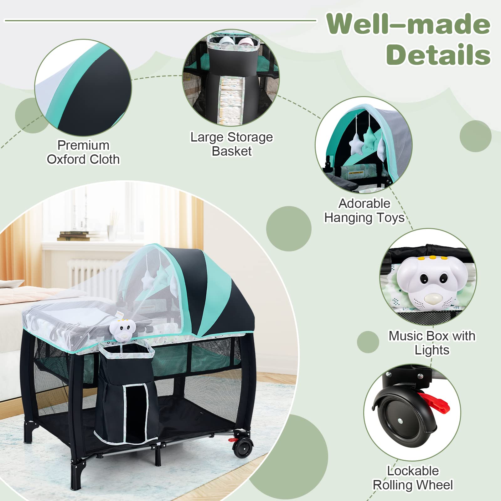 - Adjustable & Removable Net: Different from other portacots, this portable nursery center is equipped with a removable and adjustable net and canopy which not only protects your baby from bite, but also avoids direct sunlight. Besides, the 3 hanging toys and music box can attract your baby’s attention.