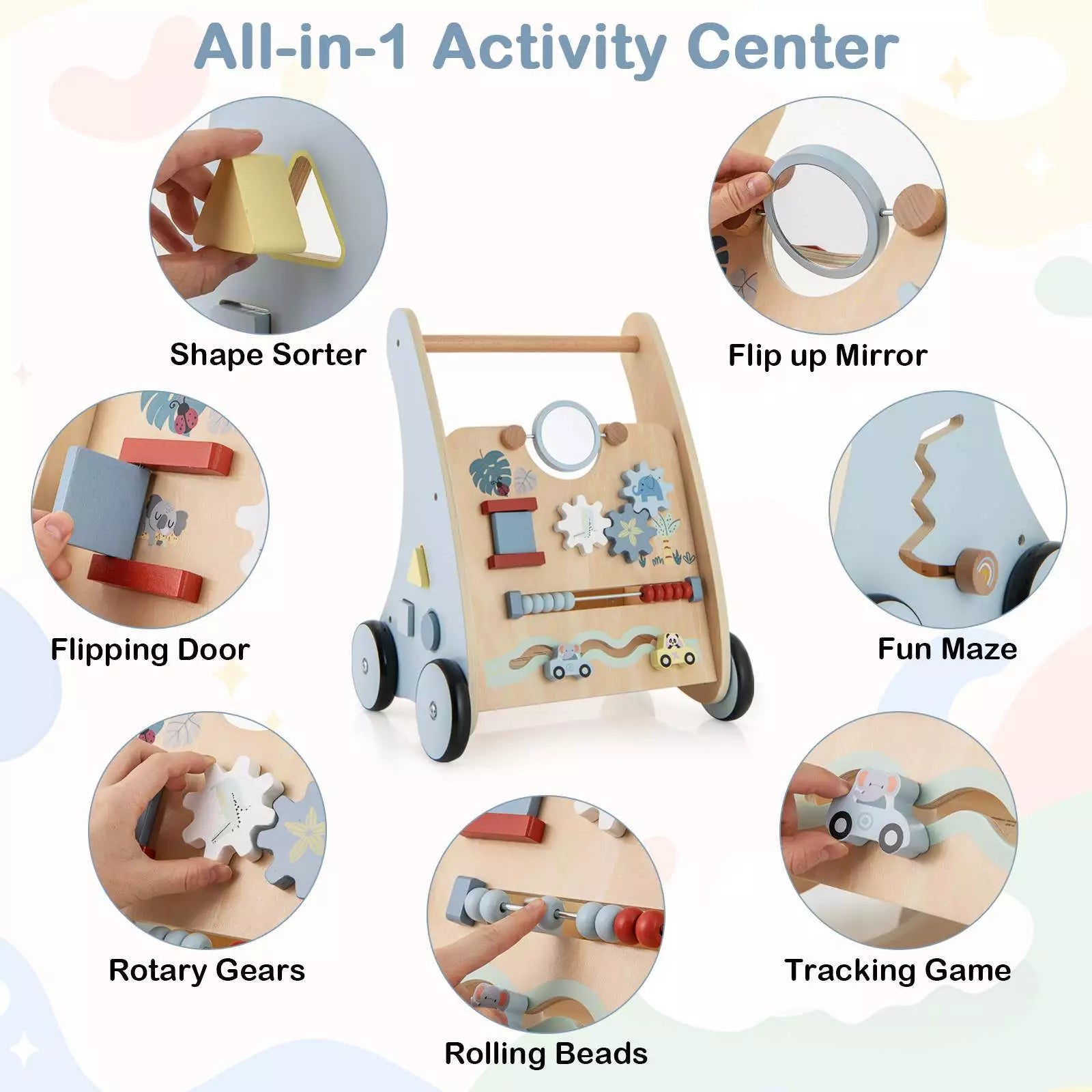 - Fun-Filled Activity Panel: Step into a world of joy with this baby walker! This adorable walker is packed with engaging gadgets including fun maze, rotatory gears, reversible mirror, winding cars, counting beads, flipping door and shapes sorter, which are perfect for hours of giggles and learning.